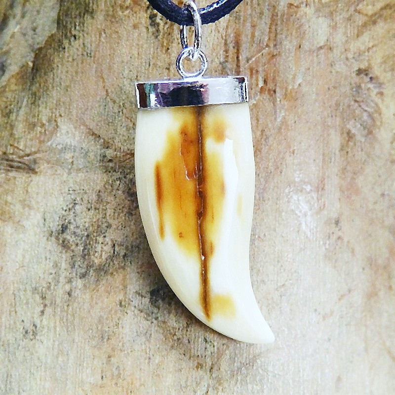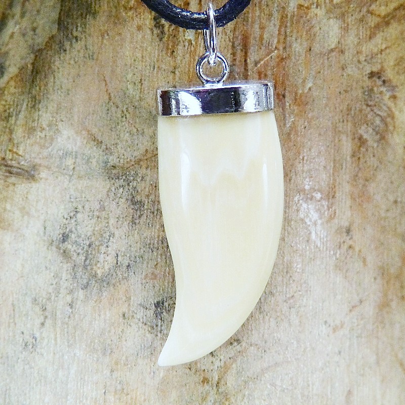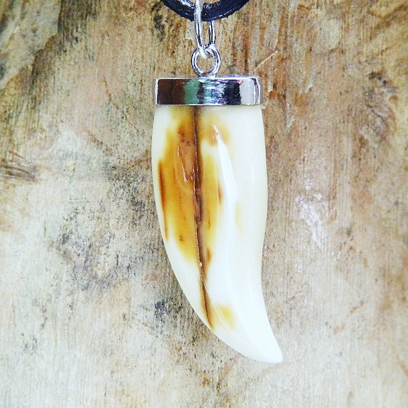 Zahnanhänger aus cremefarbenem Mammut-Elfenbein mit toller Rindenfärbung in einer Fassung aus 835/-er Silber, welches zum Anlaufschutz zusätzlich rhodiniert wurde. Die Länge des Anhängers misst ohne Öse ca. 36 mm, bei einer Breite und Dicke von ca. 15,5 x 7,5mm.