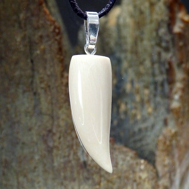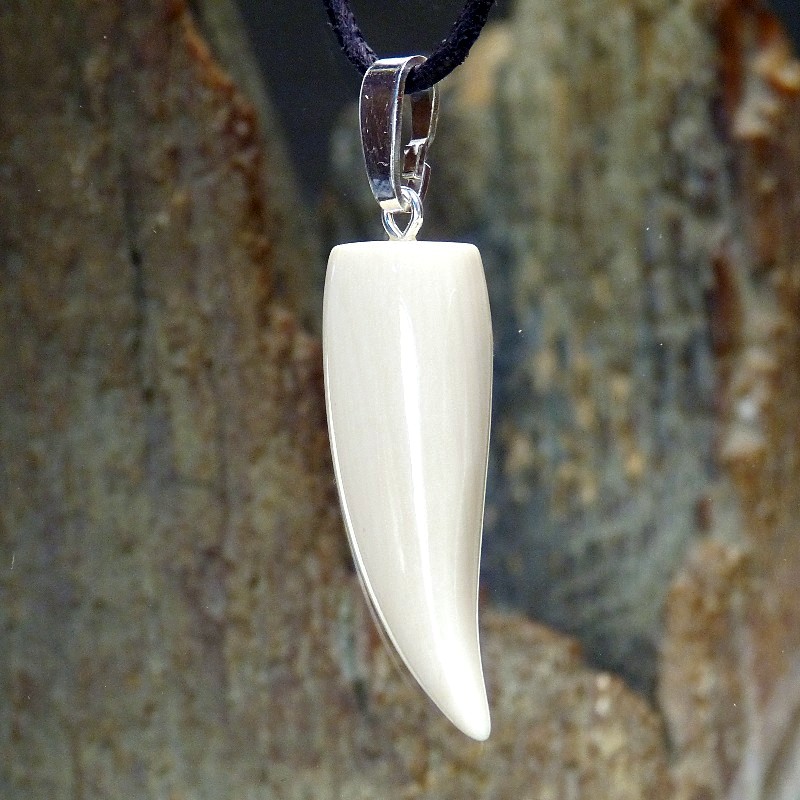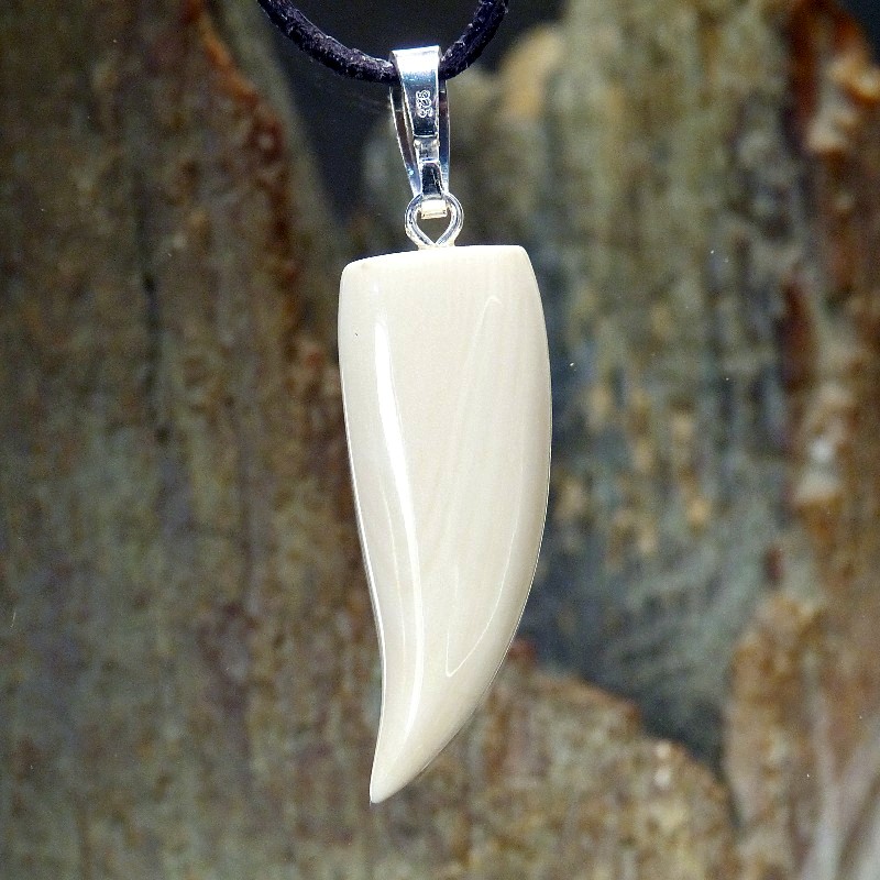 Zahnanhänger aus cremigem Mammut-Elfenbein mit feiner Maserung. Die Öse aus 925/-er Silber eignet sich für Ketten oder Bänder bis zu einem Durchmesser von ca. 3,5 mm.