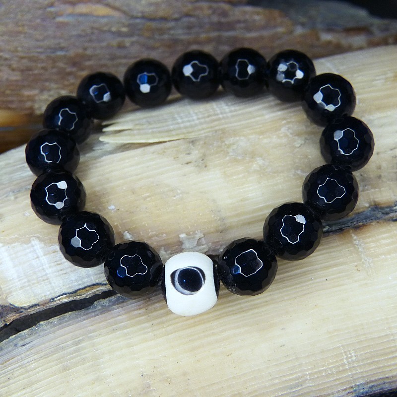 Flexibles Armband aus ca. 12mm großen Kugeln aus facettiertem Onyx, kombiniert mit einer Kugel aus hellem Mammutelfenbein.