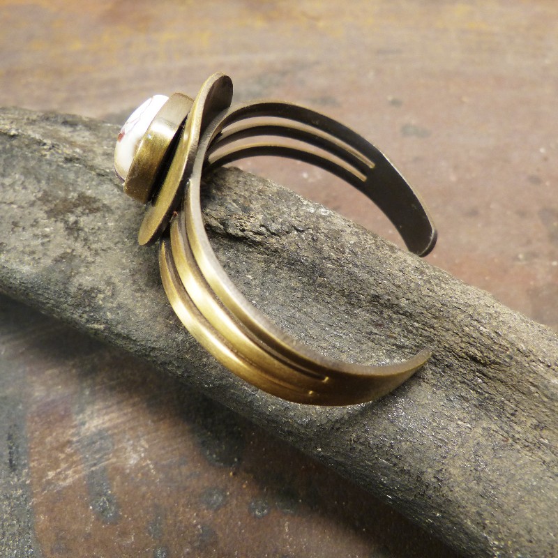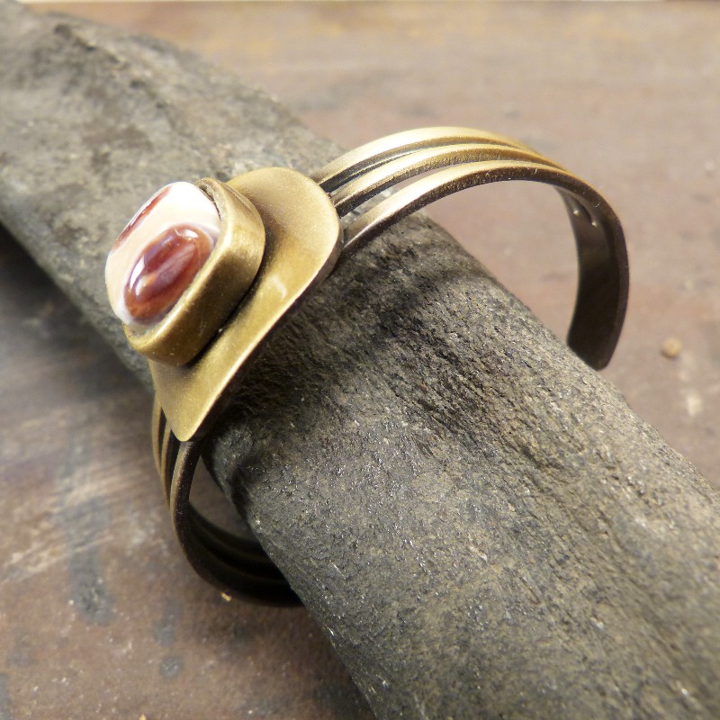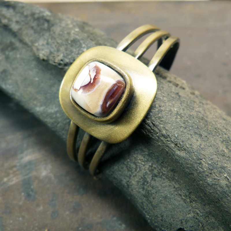Armspange aus nickelfreiem Metall in "Antik-Finish" mit einer Einlage aus schön gefärbtem fossilem Mammut-Elfenbein. Die Einlage hat eine Größe von ca. 13 x 13 mm, die Fassung misst ca. 28mm in der Breite. Innenmaß ca. 58 x 44 mm. Die Spange wird leicht seitlich über das Handgelenk geschoben.