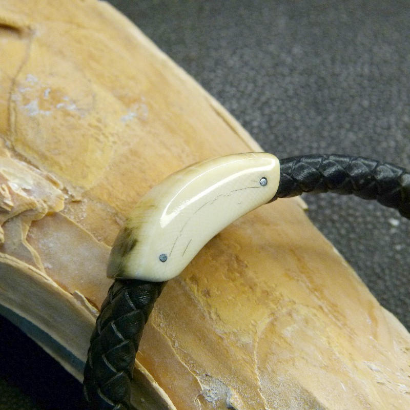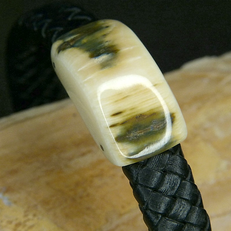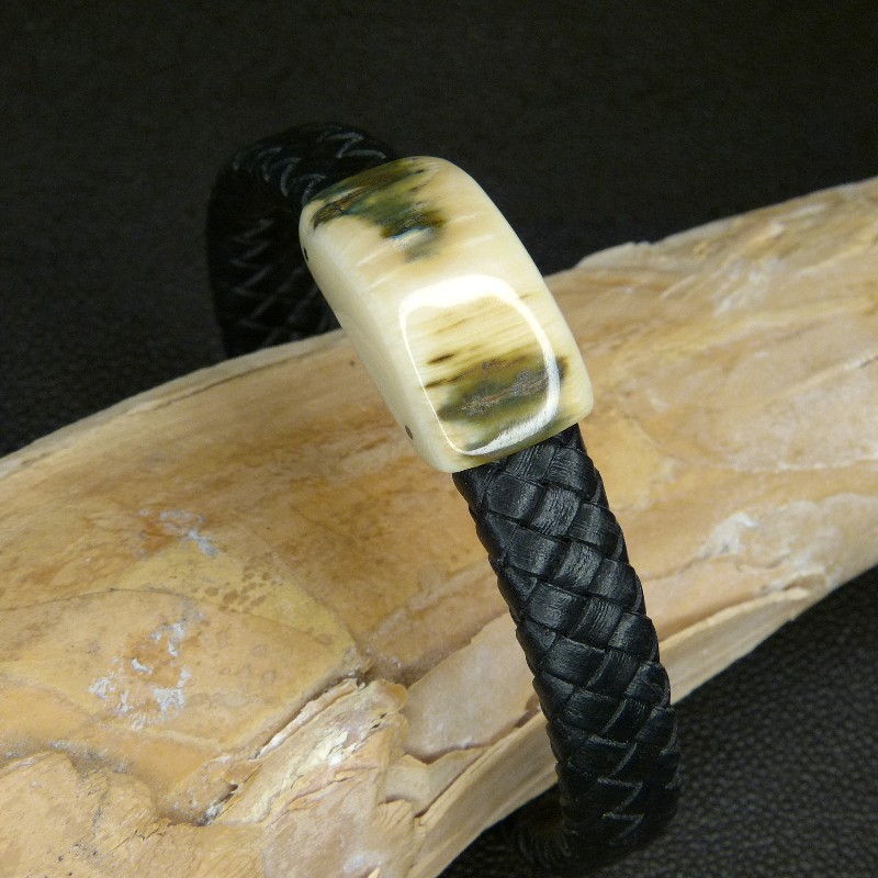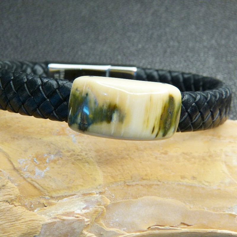 Schwarzes Flechtleder-Armband mit cremefarbenem Mammut-Elfenbein mit toller bräunlich/grünen Rindenfärbung.
