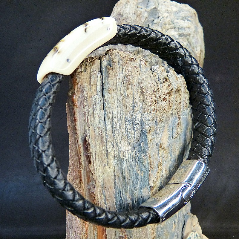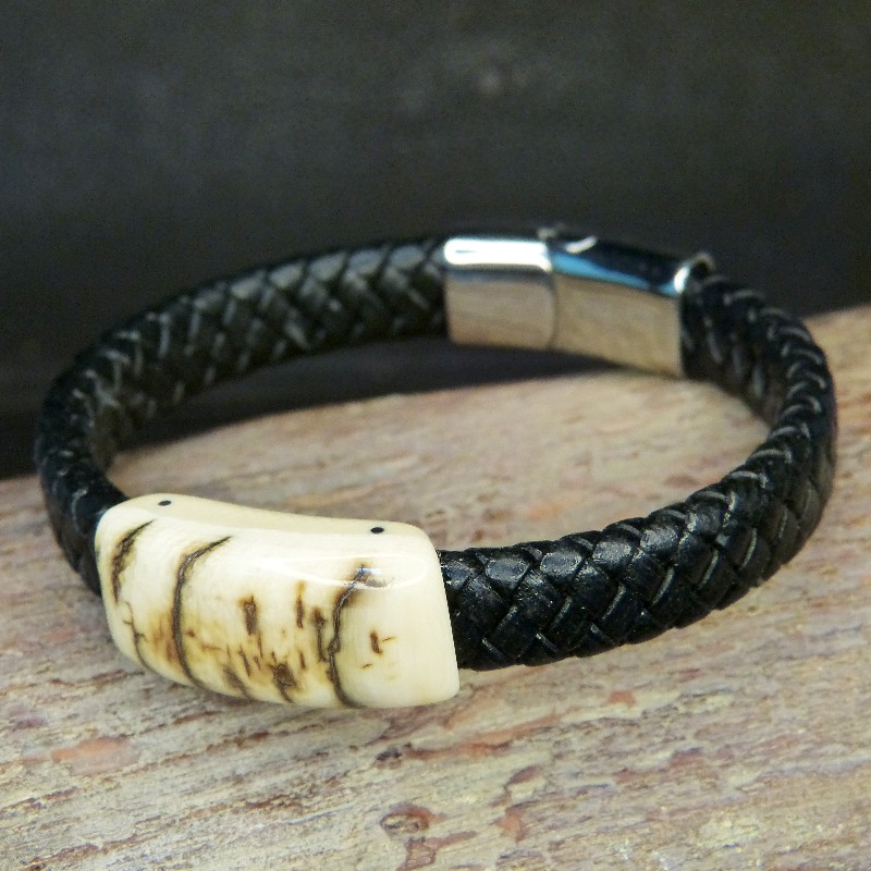 Schwarzes Flechtleder-Armband mit cremigem Mammut-Elfenbein und tollen bräunlich strukturierten Rindenfärbungen.
