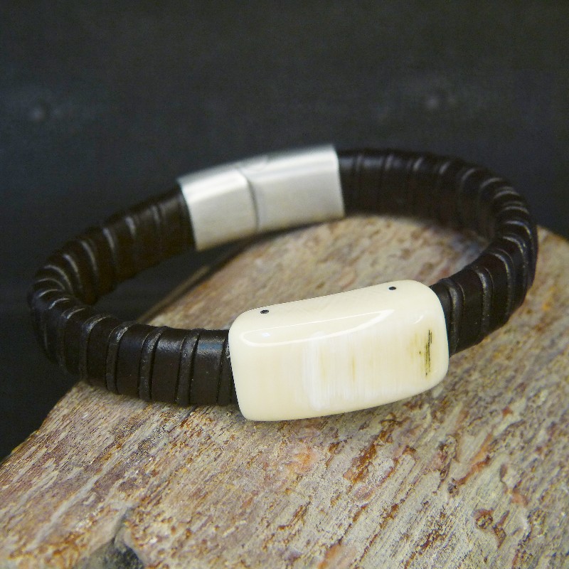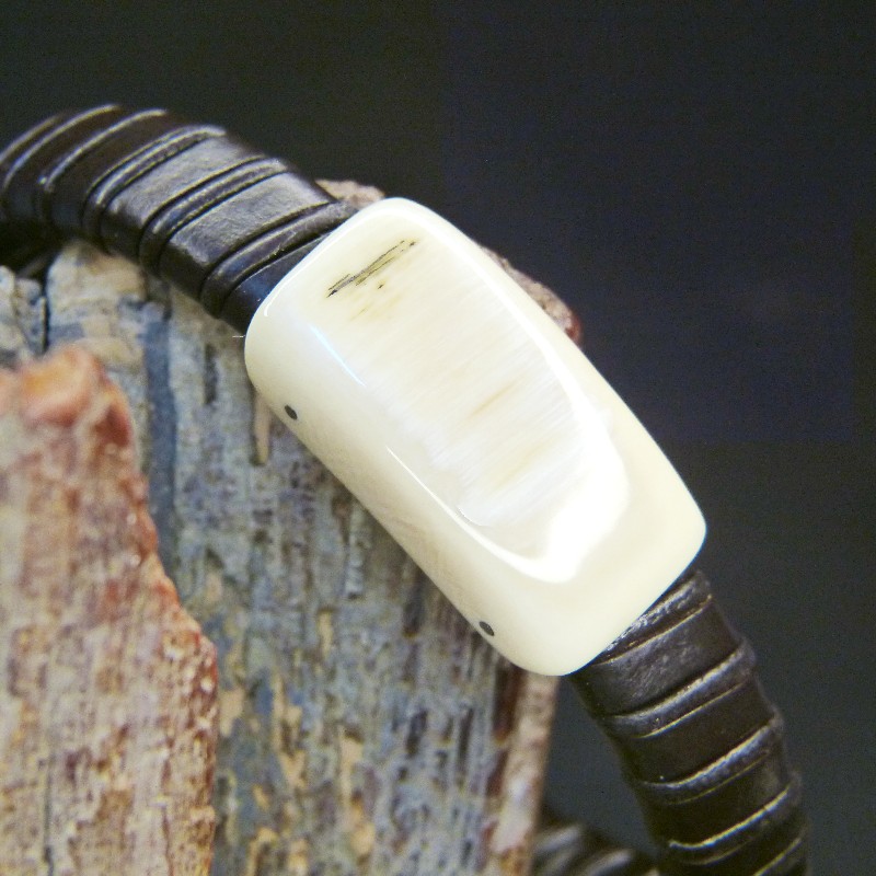 Dunkelbraunes Leder-Armband mit cremefarbenem Mammut-Elfenbein mit leichten bräunlichen Rindenfärbungen.