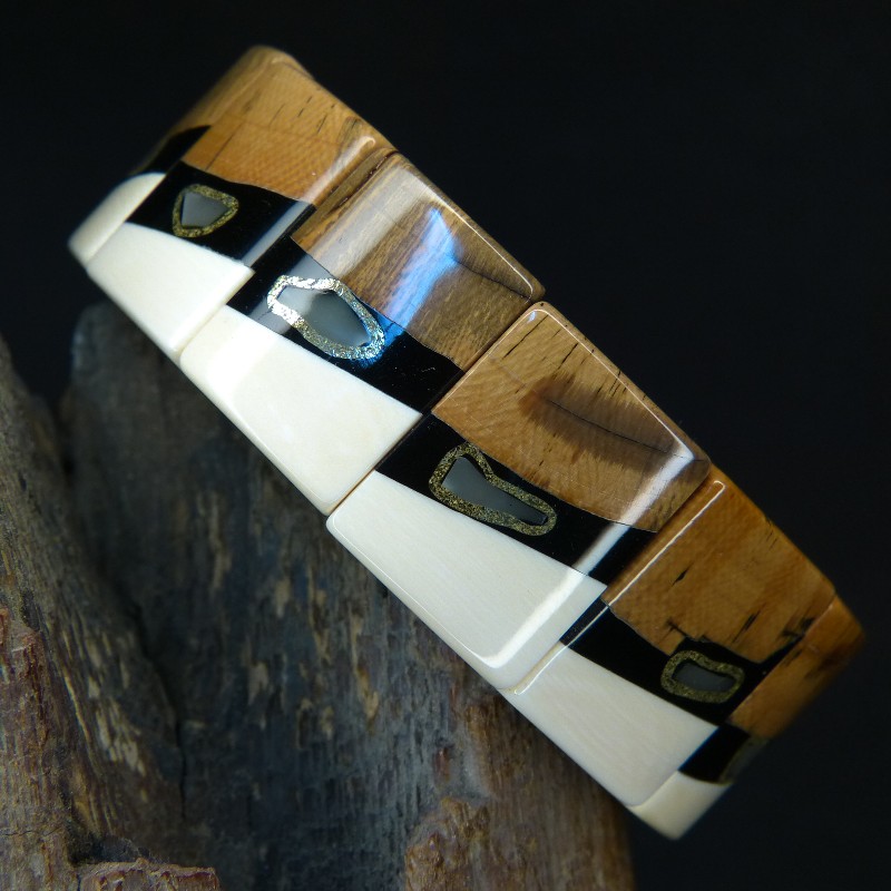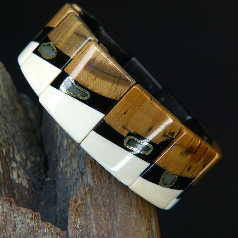 Die einzelnen Armbandteile sind auf der Rückseite zur Stabilisierung mit Ebenholz hinterlegt und flexibel auf 2-reihigem Gummi gefasst.