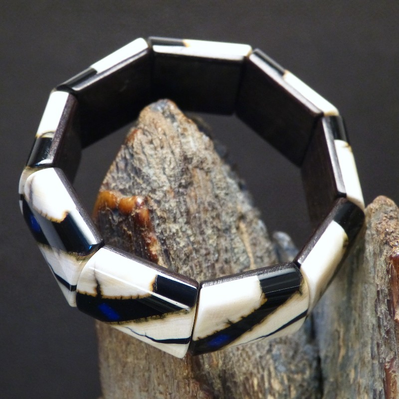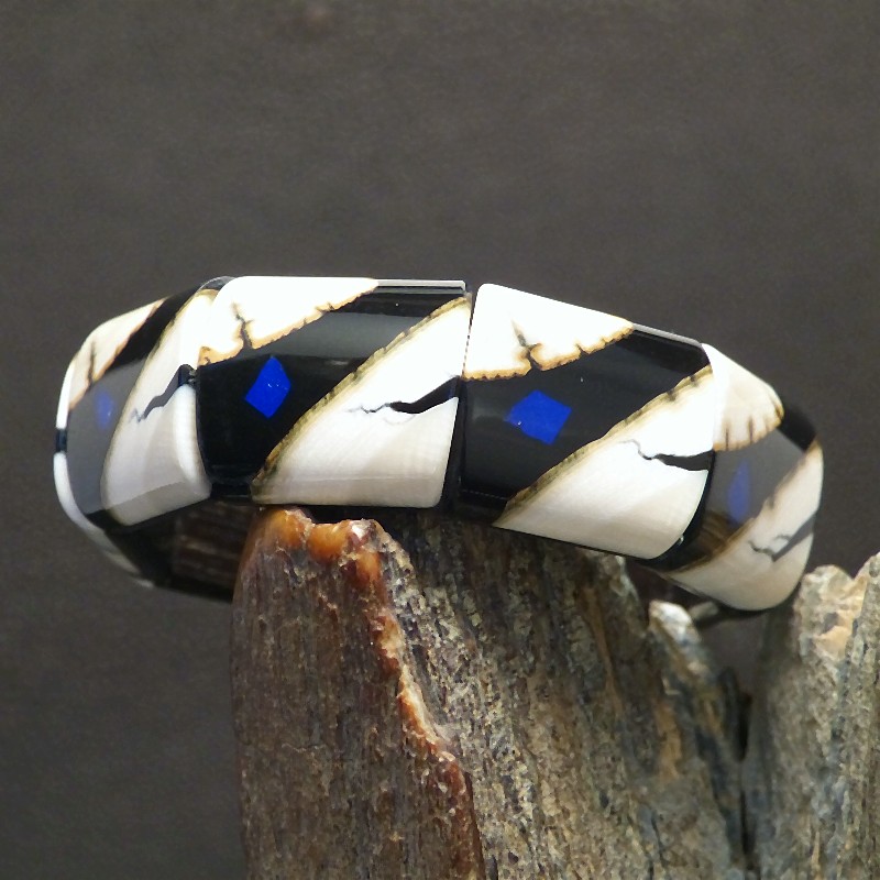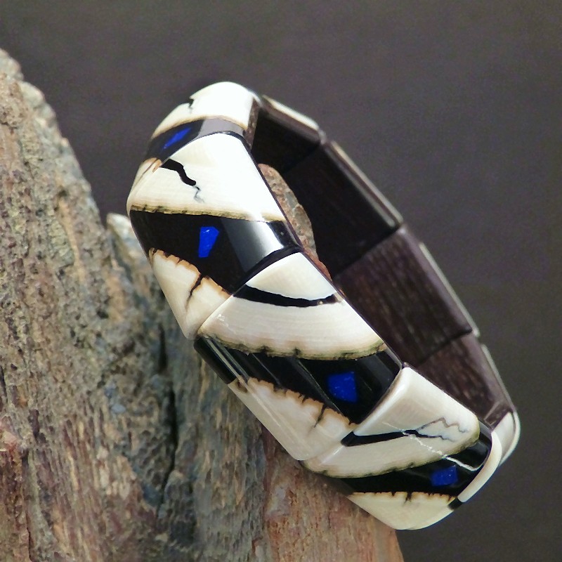 Stark strukturiertes Armband mit ca. 20 mm Breite, gefertigt aus cremefarbenem und hellem Mammut-Elfenbein mit bräunlicher Rindenfärbung. Als Intarsie wurde in jedes Glied ein kleiner rekonstruierte Lapislazuli eingearbeitet. Die einzelnen Glieder sind flexibel auf 2-reihigem Gummi gefasst und ergeben mit der abgerundeten Oberfläche einen sehr guten Tragekomfort. Das Band ist geeigent für einen Armumfang von ca. 16 bis ca. 17cm.