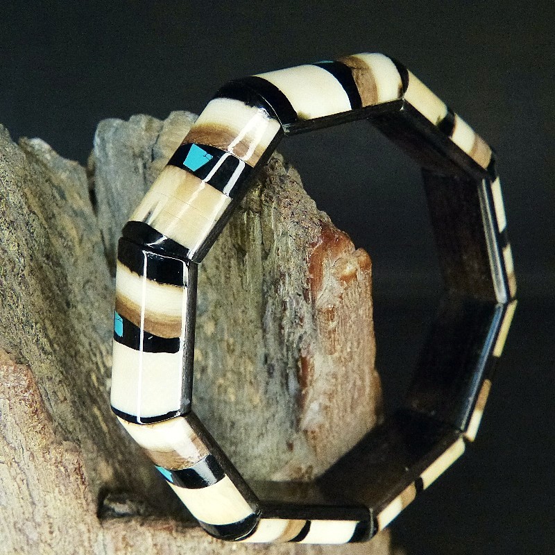 Schmales Zugarmband aus mehrfarbigem fossilem Mammut-Elfenbein, kombiniert mit Intarsien aus rekonstruiertem Türkis.