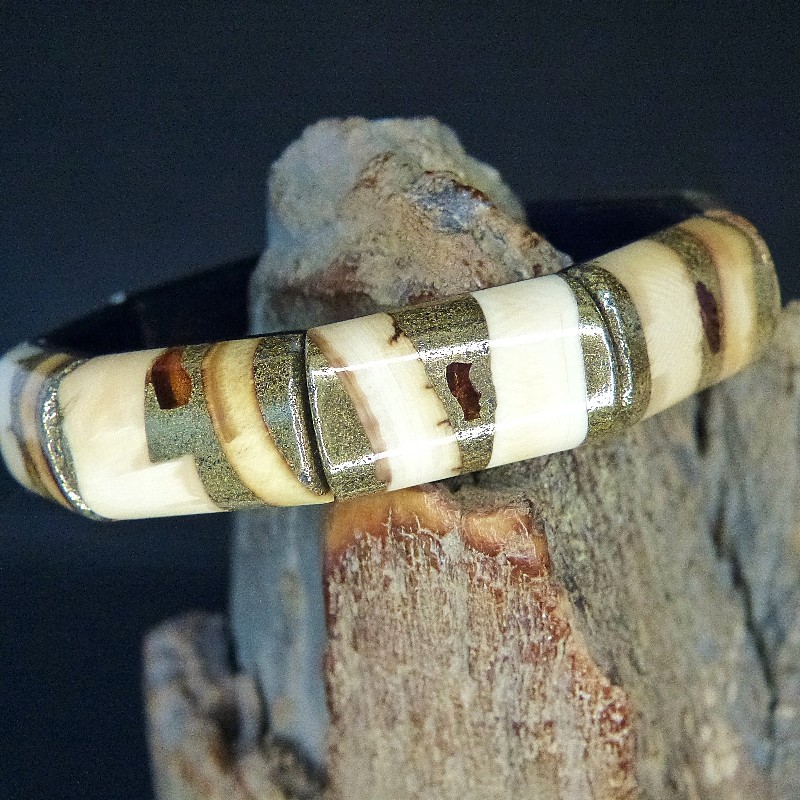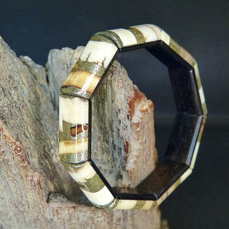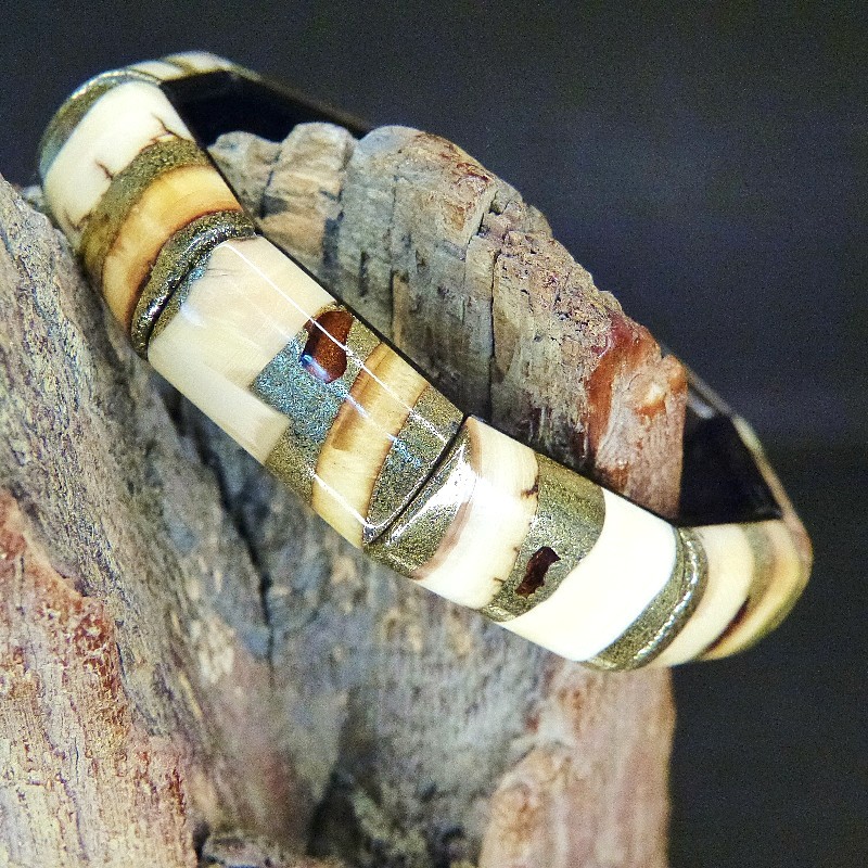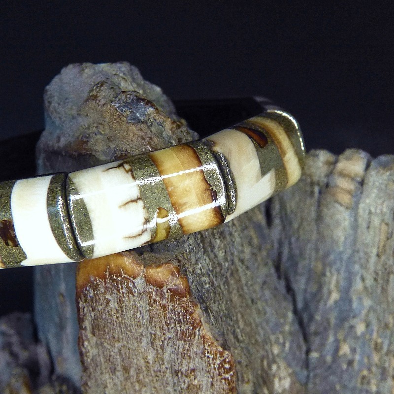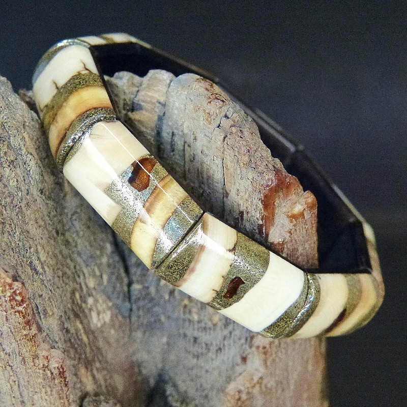 Schmales Zugarmband aus mehrfarbigem fossilem Mammut-Elfenbein, kombiniert mit Intarsien aus echtem Naturbernstein.