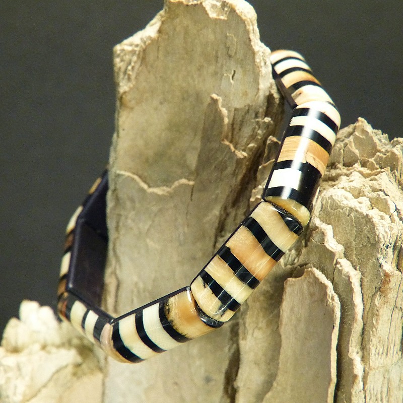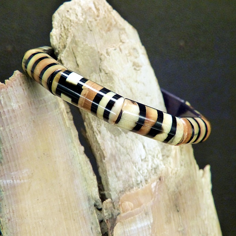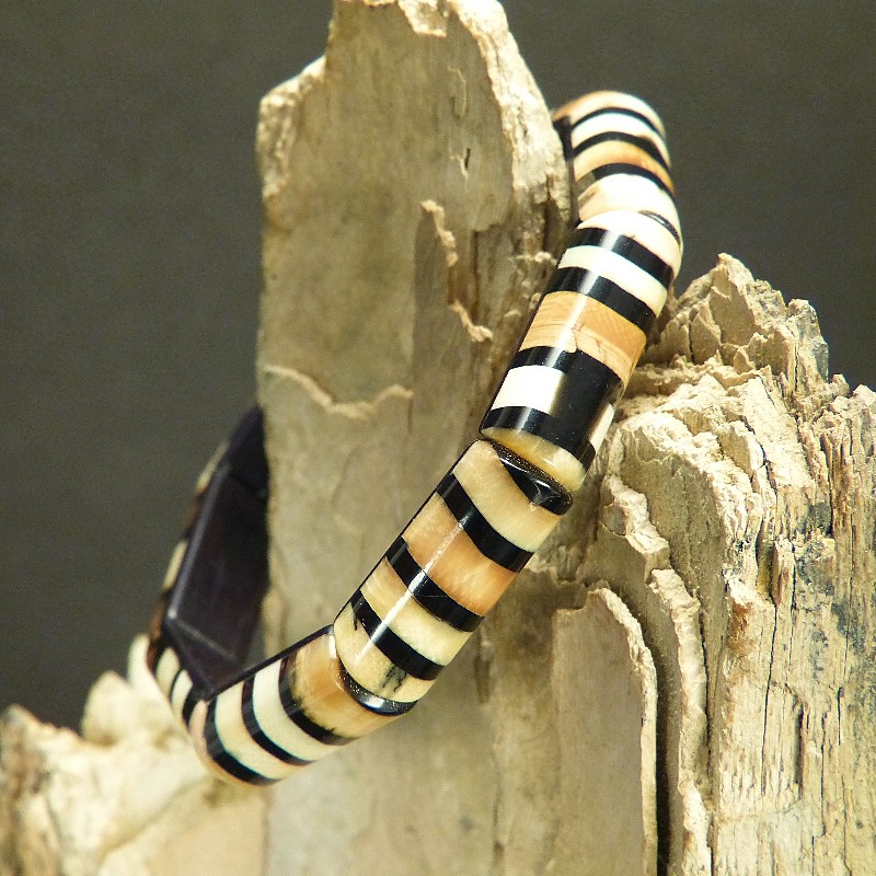 Schmales Zugarmband aus mehrfarbigem fossilem Mammut-Elfenbein. Die Innenseite der einzelnen Glieder ist zur Stabilisierung mit Ebenholz hinterlegt. Die Breite misst ca. 10mm und ist für einen bequemen Tragekomfort sowohl innen als auch außen seitlich abgerundet. Innendurchmesser ca. 58mm, geeignet für einen Armumfang bis ca.19,5 cm.