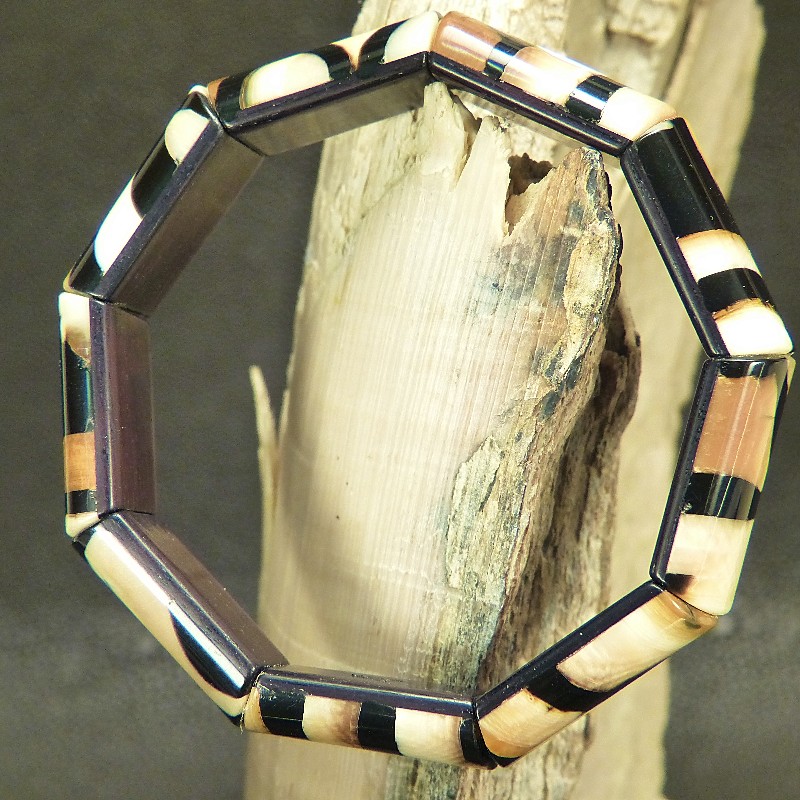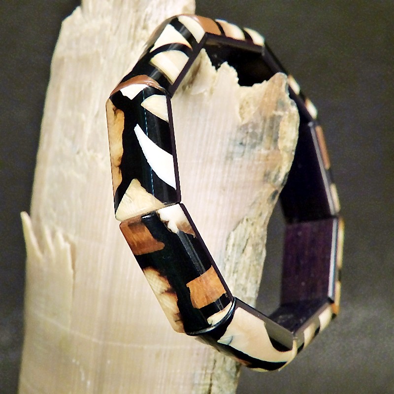 Schmales Zugarmband aus fossilem Mammut-Elfenbein mit tollen Färbungen. Die Innenseite der einzelnen Glieder ist zur Stabilisierung mit Nussbaumholz hinterlegt. Die Breite misst ca. 14mm und ist für einen bequemen Tragekomfort sowohl innen als auch außen seitlich abgerundet. Innendurchmesser ca. 59mm, geeignet für einen Armumfang bis ca. 19,5cm.