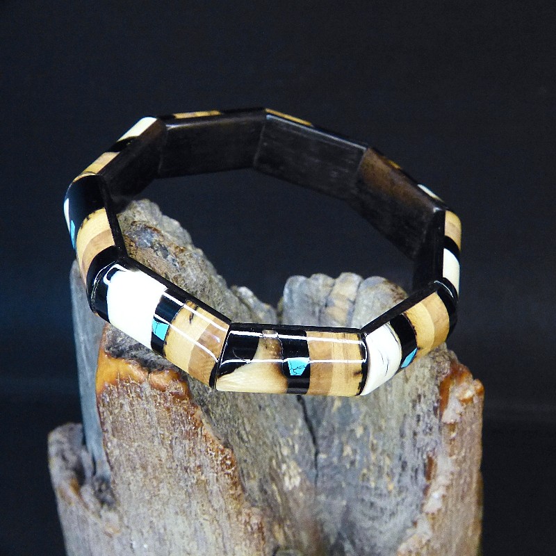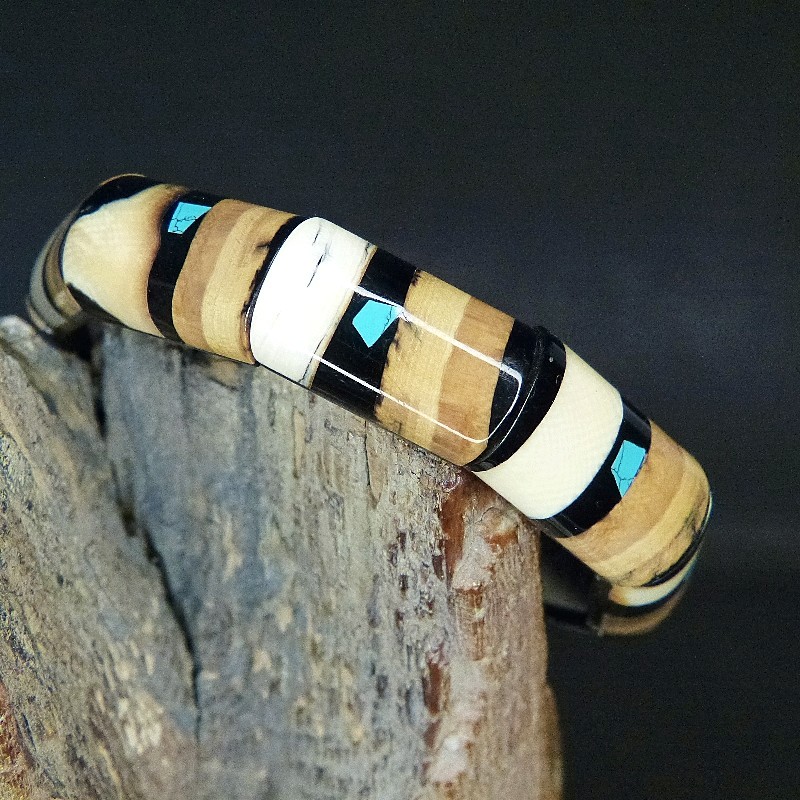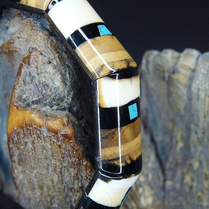 Schmales Zugarmband aus mehrfarbigem fossilem Mammut-Elfenbein, kombiniert mit Intarsien aus rekonstruiertem Türkis.