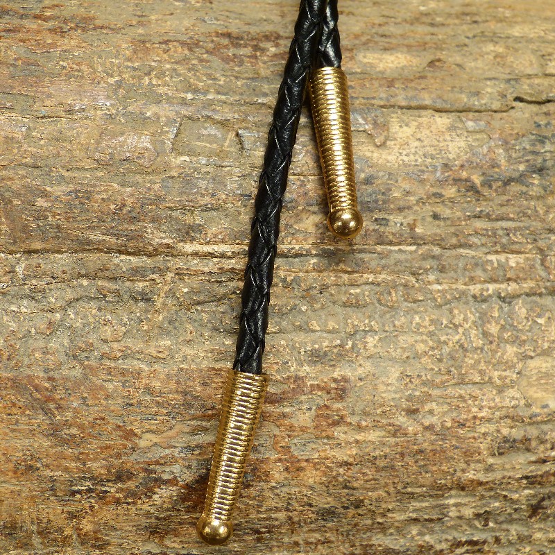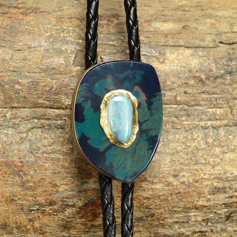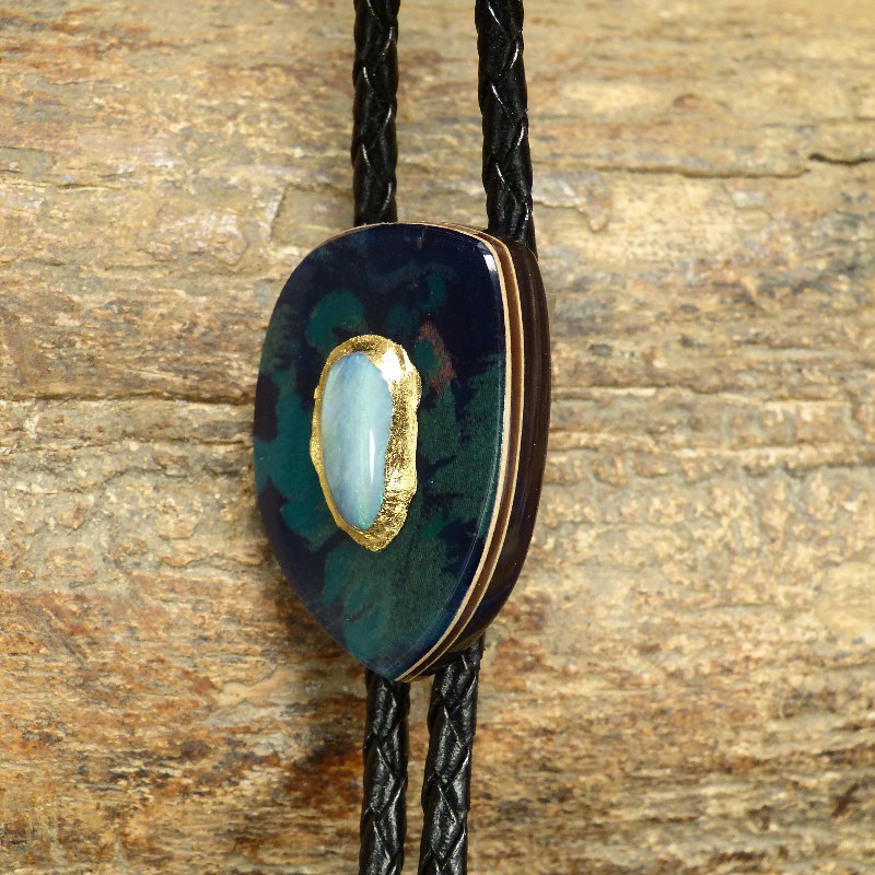 Bola aus Horn mit grün/blau schimmerndem Opal in einer Gesamtgröße von ca. 39 x 30mm. Das schwarze Flechtband kann mittels patentierter Verstellmöglichkeit schonend variiert werden.