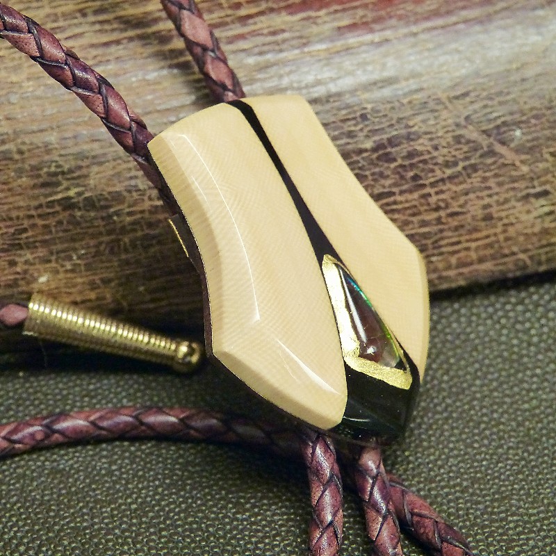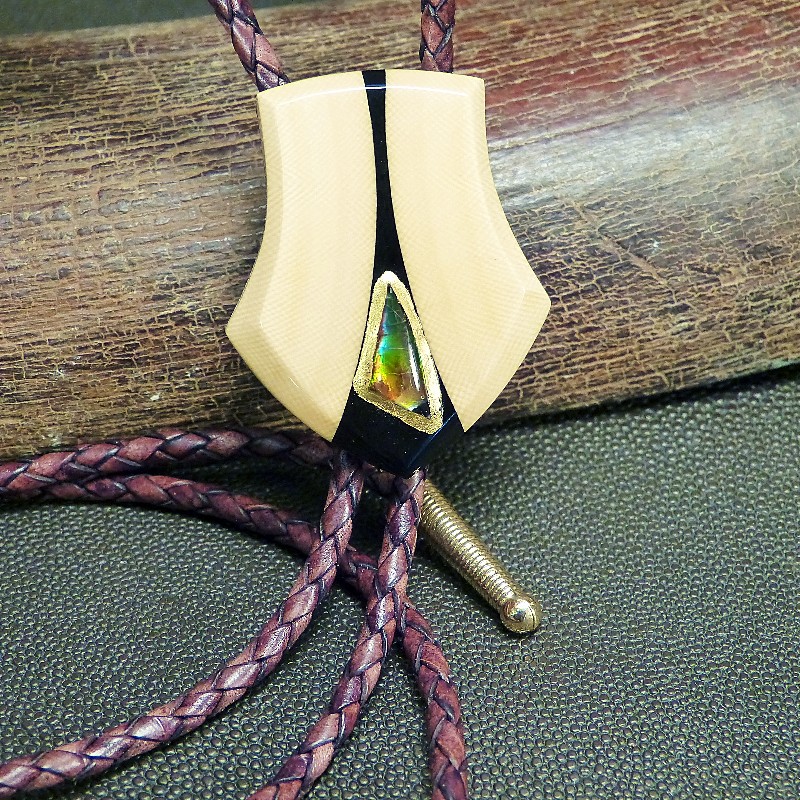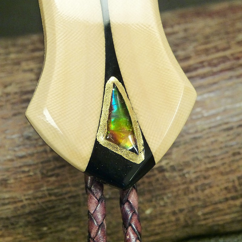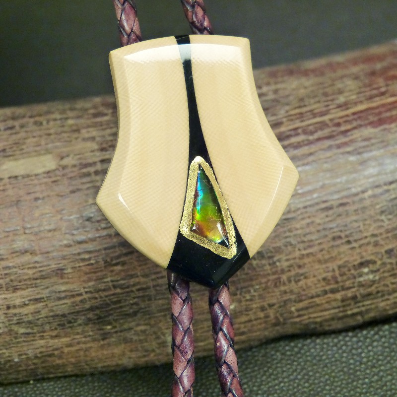 Bola aus bräunlichem Alaska-Mammut mit feiner Maserung, kombiniert mit einer Intarsie aus über 60 Mio. Jahre altem Ammolit.