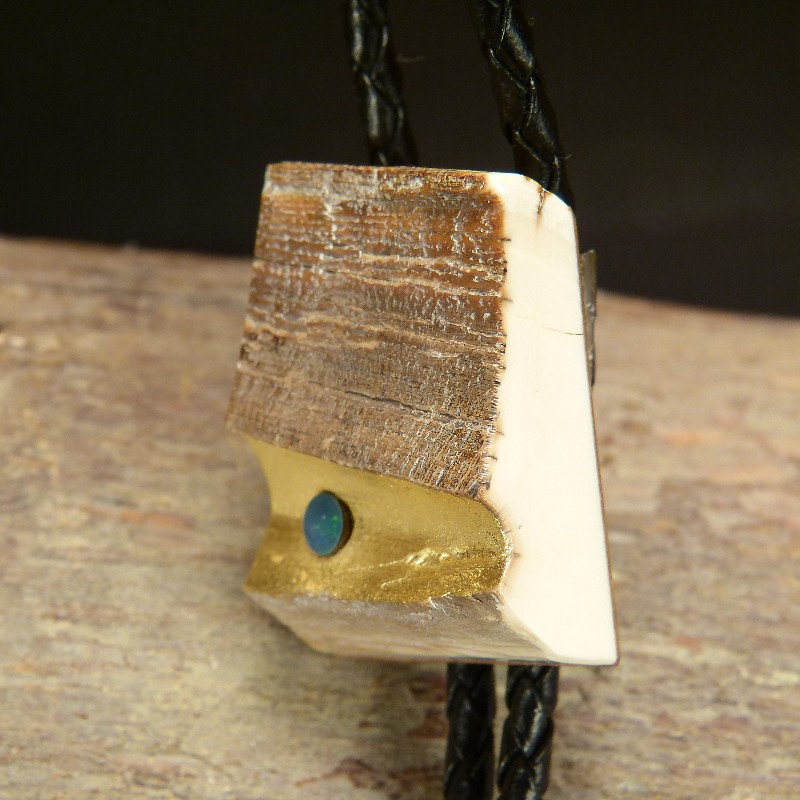 Bola aus einem verwitterten Stück Mammut-Elfenbein, kombiniert mit Blattgold und einer ca. 5mm großen, grünlich schimmernden Opal-Duplette.