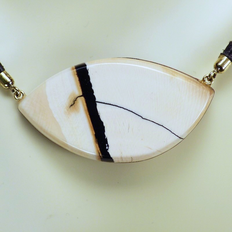 Collier aus cremefarbenem Mammut-Elfenbein mit feiner Mserung. Es hat eine Größe von ca. 49 x 26 mm und ist mit Endhülsen und einem Verschluß aus 925/-er Silber gearbeitet, die zusätzlich mit einer Auflage von 3 Micron vergoldet wurden. Die Rückseite wurde zur Stabilisierung zusätzlich mit Nussbaumholz hinterlegt. Mit dem Band aus schwarzem Ziegenleder hat das Collier eine Gesamtlänge von ca. 46 cm. Sollten Sie eine andere Länge benötigen, so können Sie uns dies während des Bestellvorgangs bei Bemerkungen mitteilen.