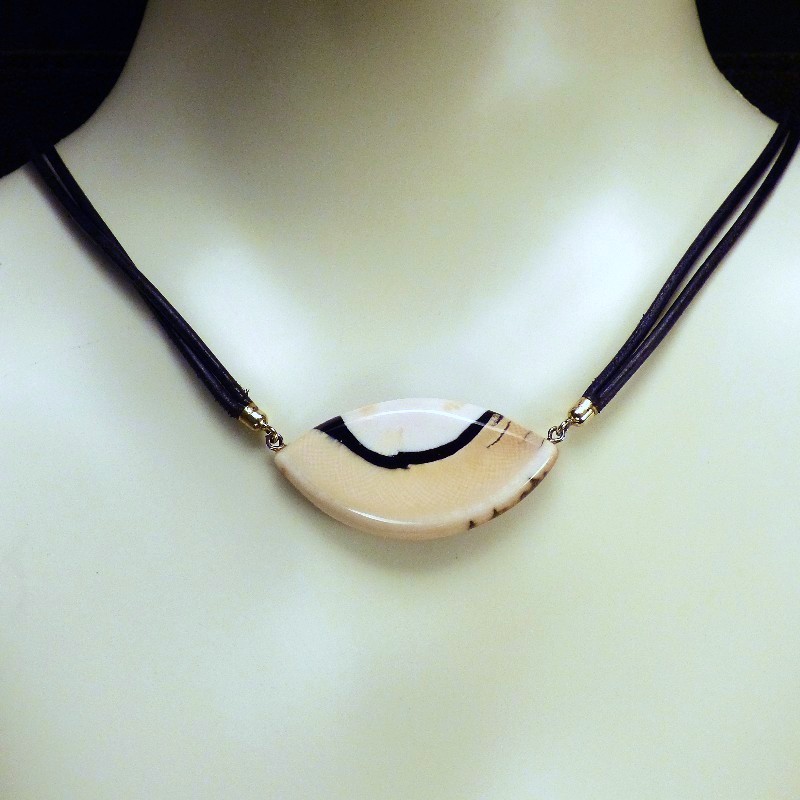 Kleines Collier aus hellem und beigem Mammut-Elfenbein mit feiner Maserung und leichter Außenrinde. Es hat eine Größe von ca. 45 x 22 mm und ist mit Endhülsen und einem Verschluß aus 925/-er Silber gearbeitet, die zusätzlich in einer Stärke von 3 Micron vergoldet wurden. Die Rückseite wurde zur Stabilisierung zusätzlich mit Nussbaumholz hinterlegt. Mit dem Band aus schwarzem Ziegenleder hat das Collier eine Gesamtlänge von ca. 49 cm. Sollten Sie eine andere Länge benötigen, so können Sie uns dies während des Bestellvorgangs bei Bemerkungen mitteilen. Separate Verlängerungen können Sie außerdem unter Zubehör bestellen.