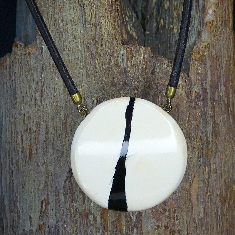 Inklusive des schwarzen Ziegenlederbandes misst das Collier in der Gesamtlänge ca. 51 cm.
