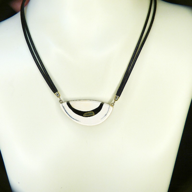 Es hat eine Größe von ca. 43 x 22 mm und wurde auf der Rückseite zur Stabilisierung mit Nussbaumholz hinterlegt. Als Blickfang wurde zusätzlich eine kleine rekonstruierte Jade als Intarsie eingearbeitet. Inklusive dem schwarzen Lederband hat es eine Gesamtlänge von ca. 49 cm, Verschluss und Endkappen sind aus goldplattiertem Silber 925/- gefertigt.