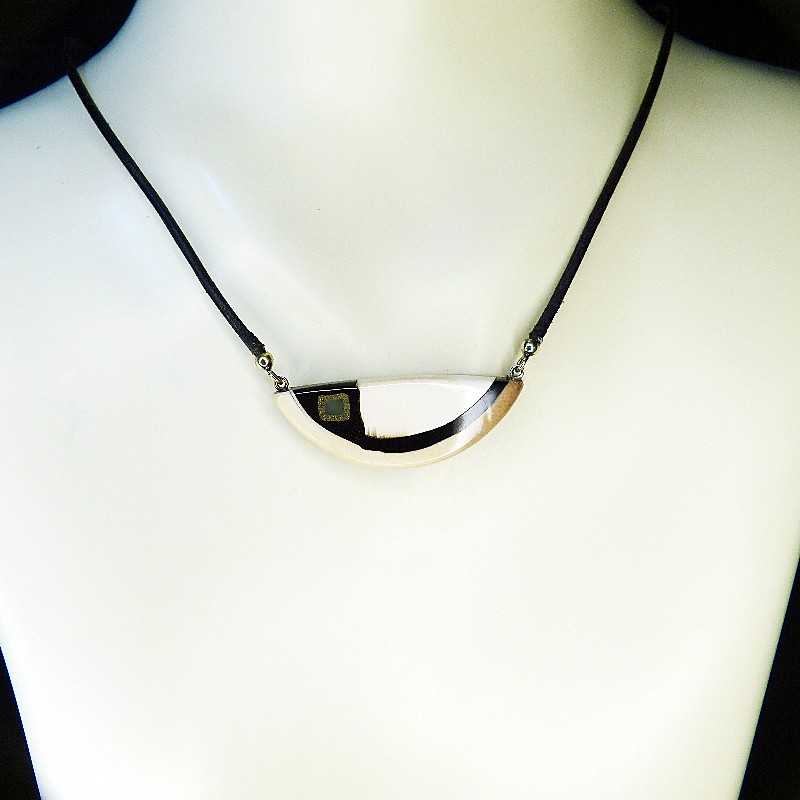 Es hat eine Größe von ca. 47 x 17 mm und wurde auf der Rückseite zur Stabilisierung mit Nussbaumholz hinterlegt. Als Blickfang wurde zusätzlich eine kleine rekonstruierte Jade als Intarsie eingearbeitet. Inklusive dem schwarzen Lederband hat es eine Gesamtlänge von ca. 46 cm, Verschluss und Endkappen sind aus goldplattiertem Silber 925/- gefertigt.