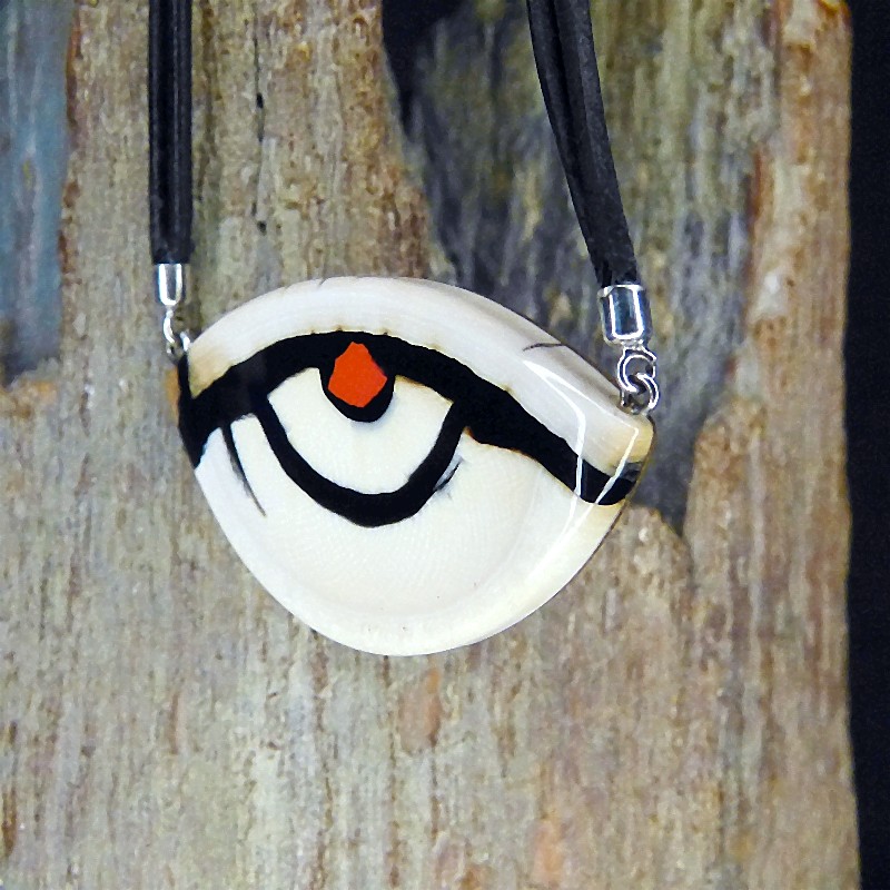 Helles Collier aus fossilem Mammut-Elfenbein mit kleiner braunen Ecke und einer Intarsie aus rekonstruierter Koralle.