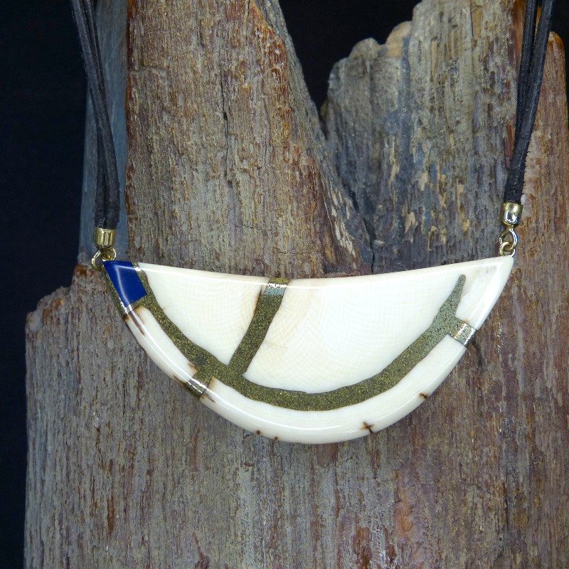 Collier aus cremefarbenem Mammut-Elfenbein mit feiner Maserung und einer Intarsie aus Lapislazuli, der ca. 4-5 mm tief in die golden schimmernde Metalllegierung eingelassen wurde, wobei die Rückseite zur Stabilisierung mit Nussbaumholz hinterlegt wurde.