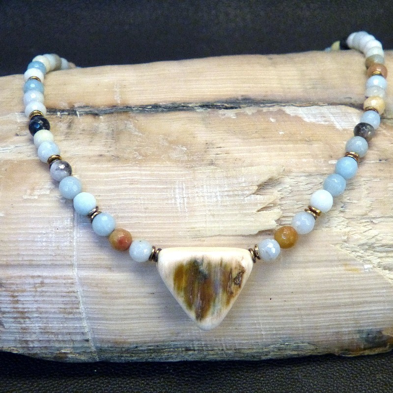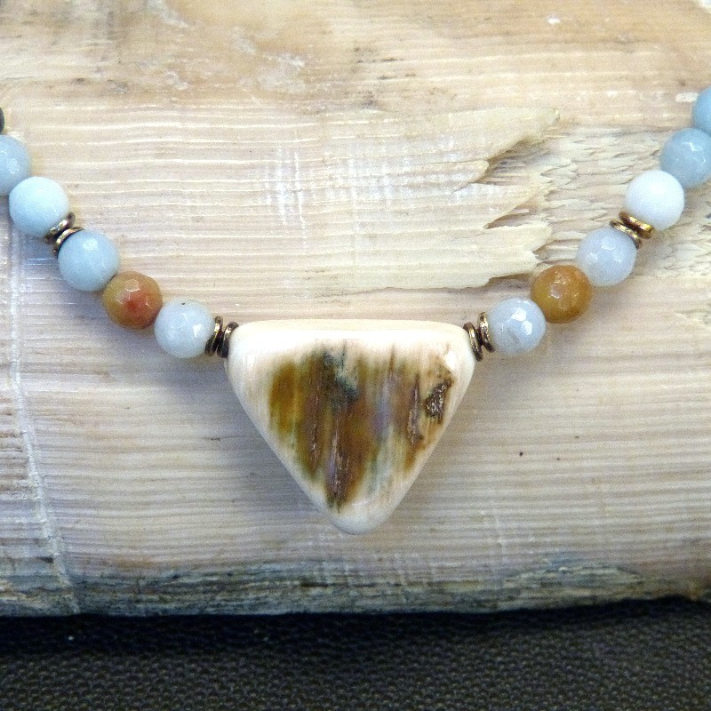 Mittig ist ein dreieckiges Naturstück aus fossilem Mammut-Elfenbein mit schöner Rindenfärbung eingearbeitet.