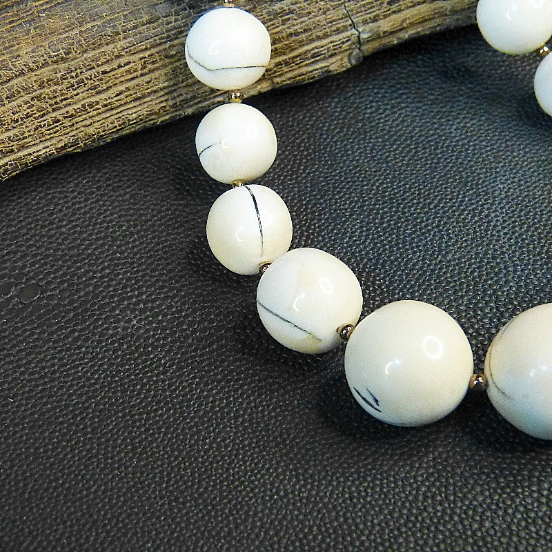 Von Hand geschliffene Kugelkette aus cremefarbenem Mammut-Elfenbein mit bräunlichen Färbungen, entstanden durch jahrtausende lange Lagerung im Permafrostboden Sibiriens.