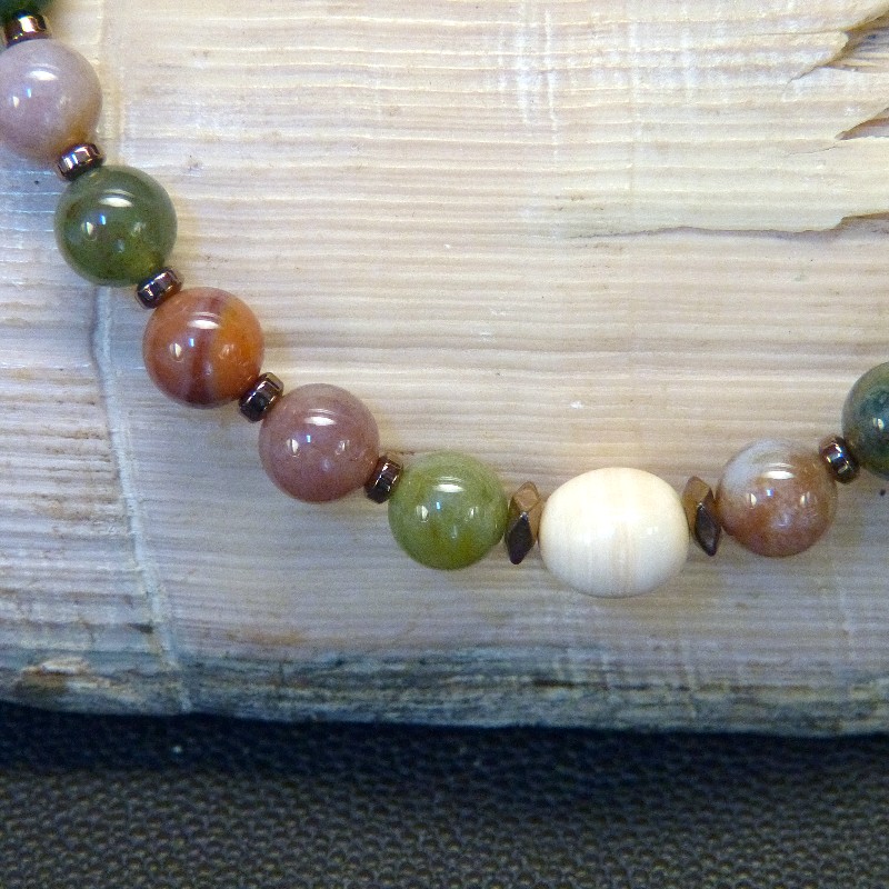 Collier aus ca. 8mm großen verschiedenfarbigen Achatkugeln, kombiniert mit Zwischenelementen aus bronzefarbenem Hämatit und einer von Hand geschliffenen Kugel aus cremefarbenem Mammut-Elfenbein.
