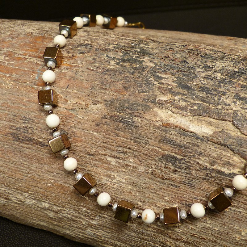 Feines Collier aus ca. 5,5 mm großen Kugeln aus hellem Mammut-Elfenbein, kombiniert mit kleinen Süßwasserperlen sowie Würfeln aus Hämatit. Der