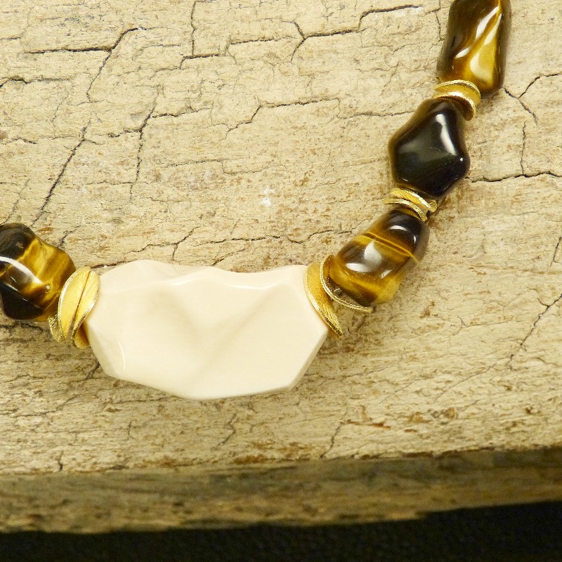 Collier aus ca. 10 mm großen naturförmigen Tigerauge-Elementen, kombiniert mit Silber/vergoldeten (925/-) Zwischenscheiben und Karabiner sowie einem Mittelstück aus cremefarbenem Mammut-Elfenbein. Die Kette hat eine Gesamtlänge von ca. 46 cm und wird durch einen mehrfach gedrehten Stahldraht sicher gehalten.