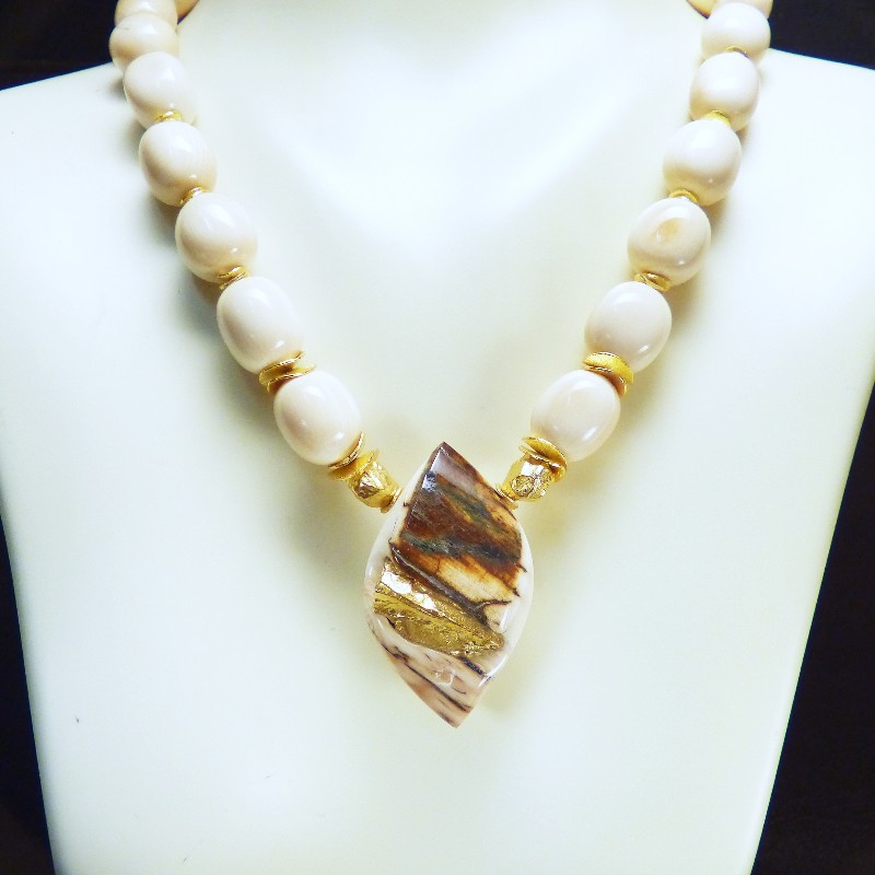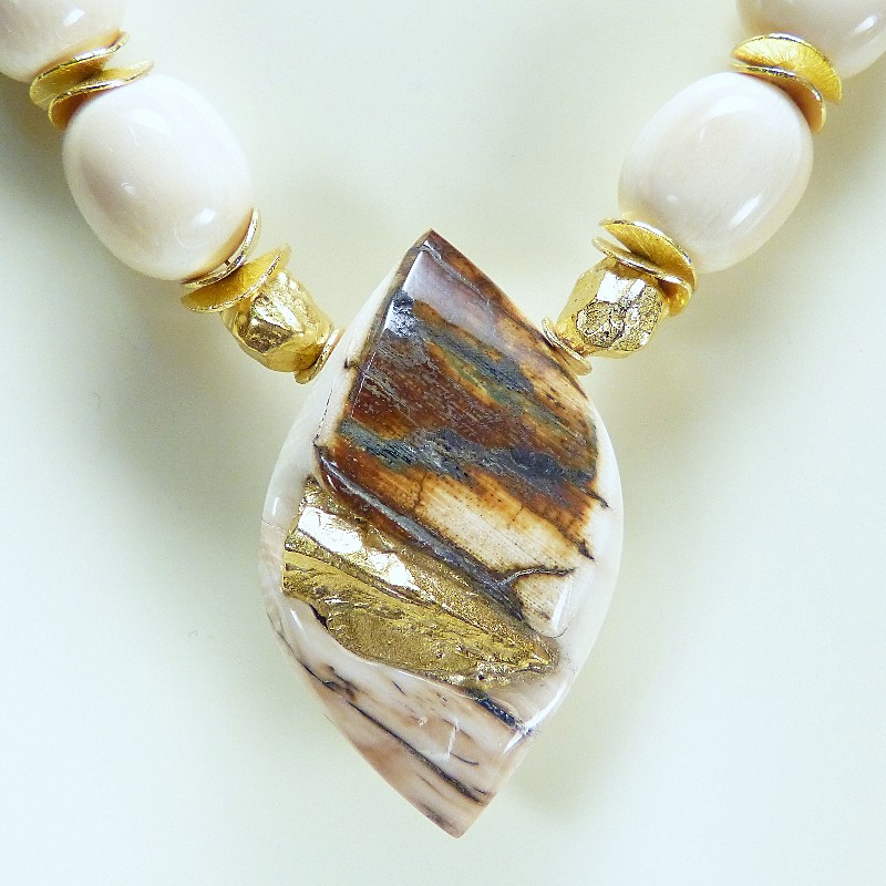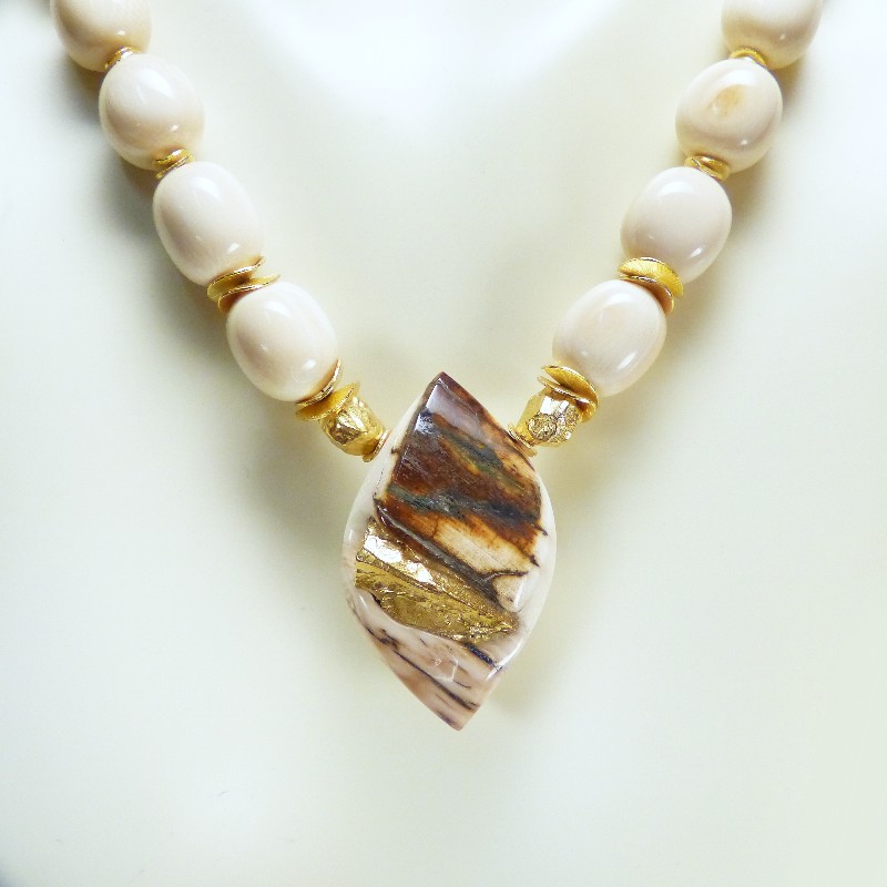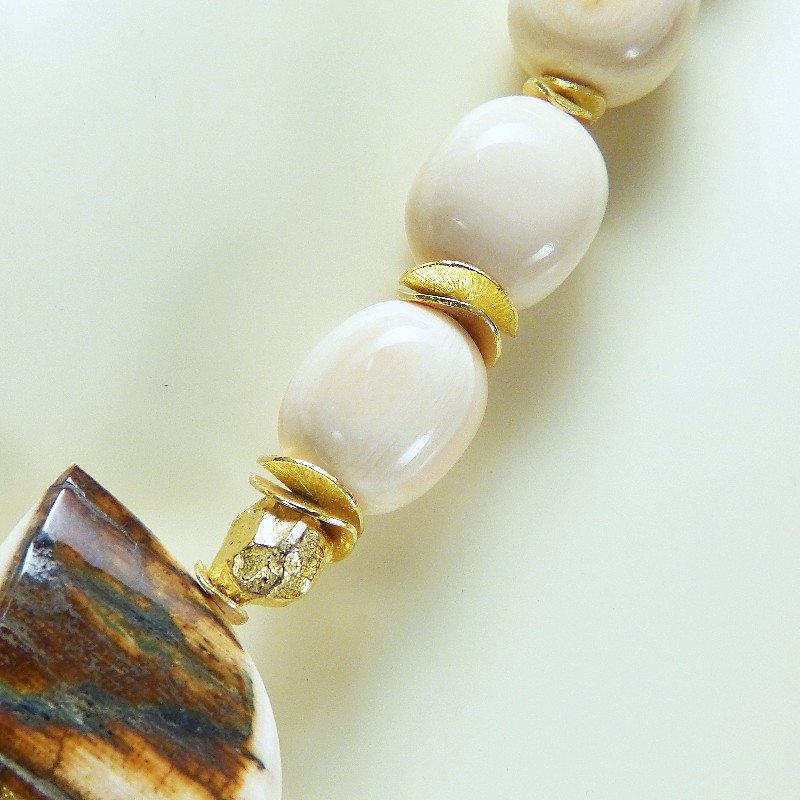 Edle auffällige Kette aus von Hand geschliffenen, cremefarbenen Mammutkugeln mit einem Mittelelement aus bräunlicher Mammutrinde.