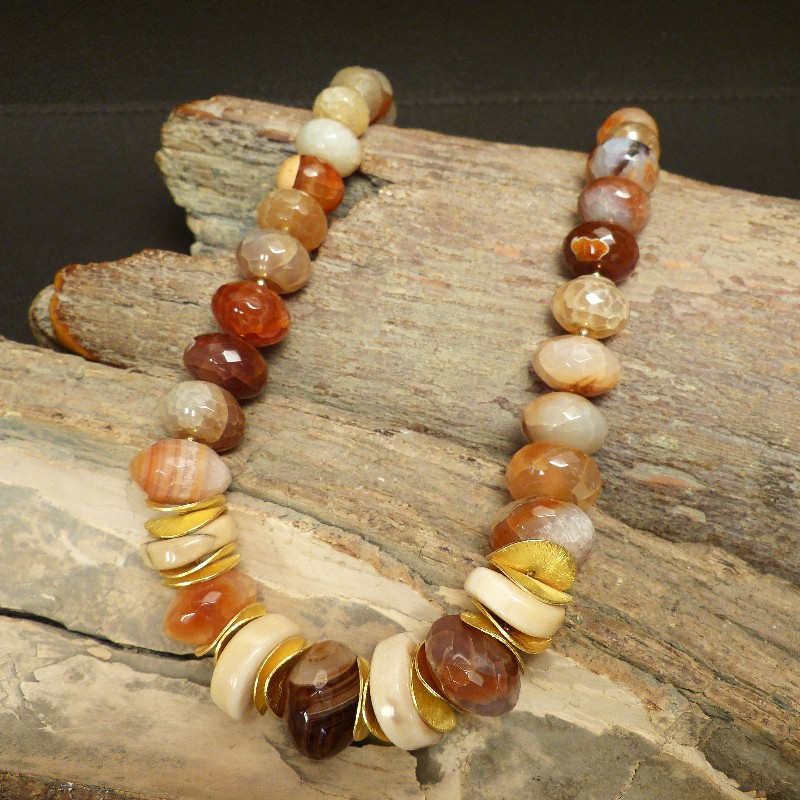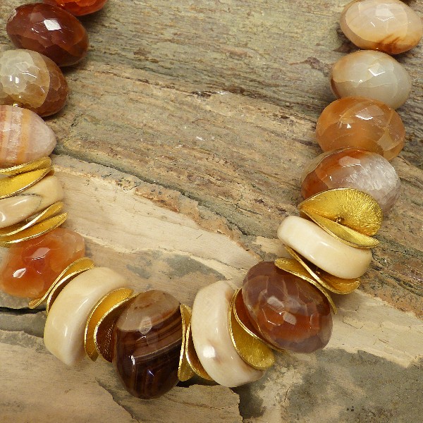 Einzeln facettierte Scheiben aus rötlichen Achaten, kombiniert mit Scheiben aus naturfarbenem Mammut-Elfenbein und Zwischenelementen aus