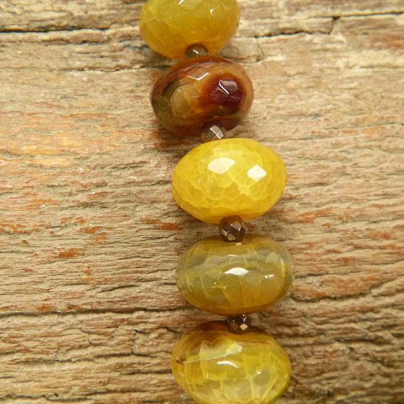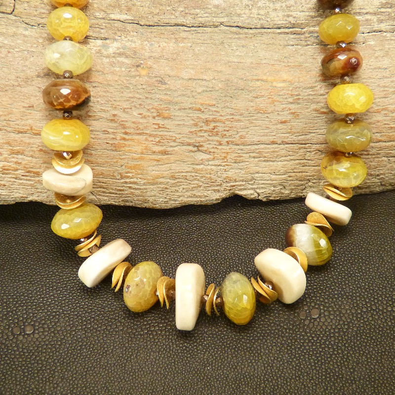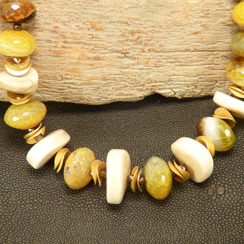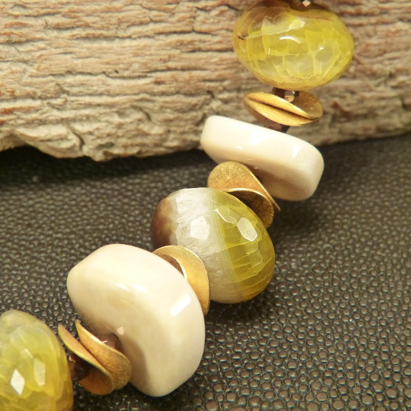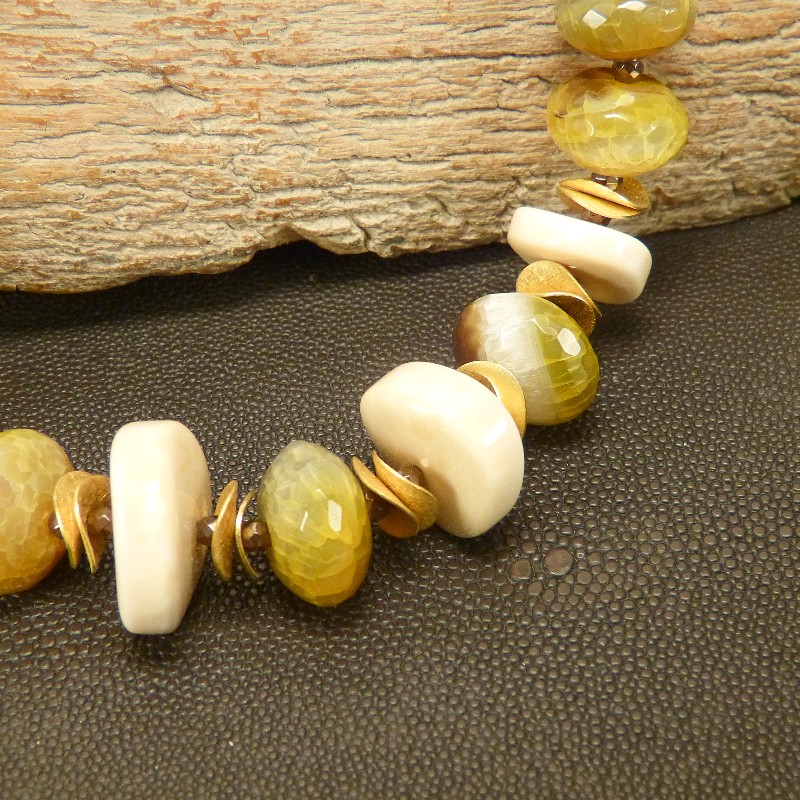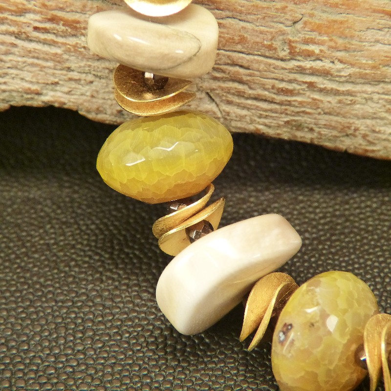 Auffällige, ca. 65cm lange Kette aus facettierten Achaten und kleinen Hämatit-Zwischenkugeln, kombiniert mit cremefarbenem Mammut-Elfenbein und vergoldeten Wellen aus 925/-er Silber.