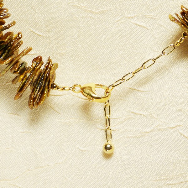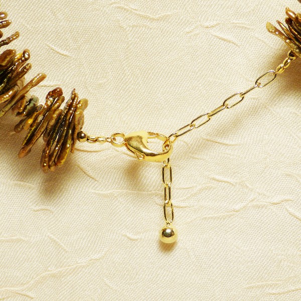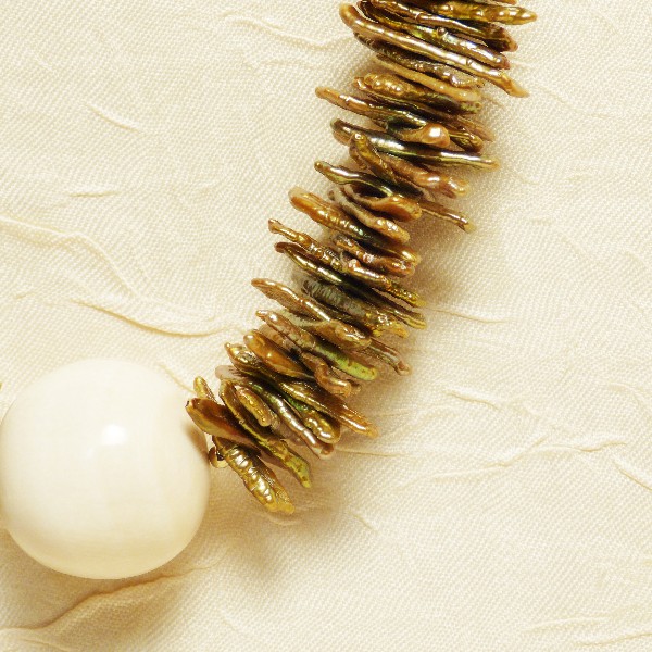 dass das Material in ca. 5-7 mm breite Segmente zerfallen ist. Diese Kugel hat jedoch eine Stärke von ca. 26 mm und ist mit wunderschönen flachen Süßwasserperlen kombiniert. Sie hat eine Länge von ca. 41