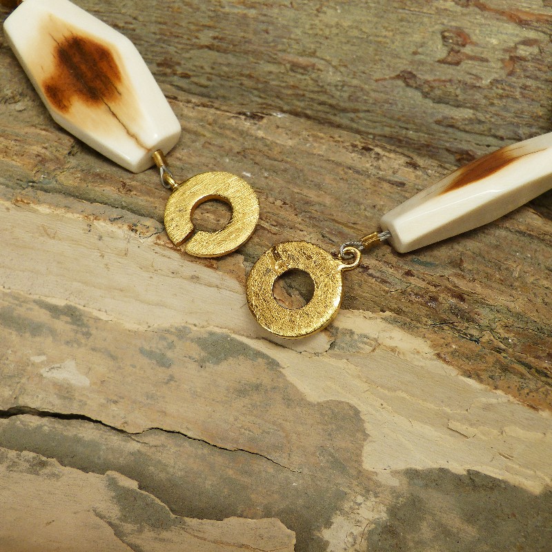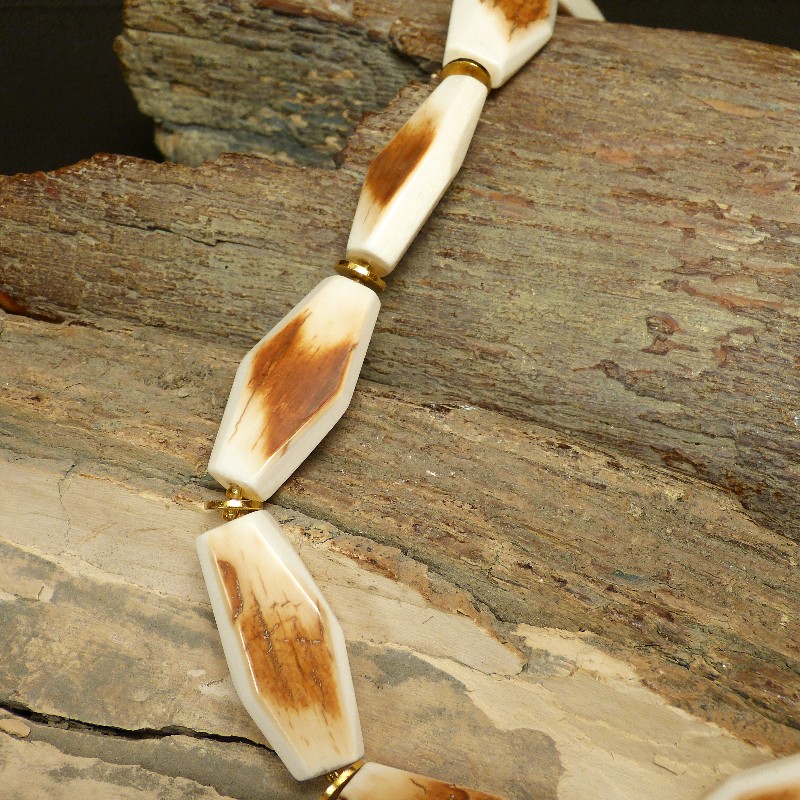 fossilem Mammut-Elfenbein mit tollen Färbungen. Die Elemente sind zwischen ca. 32 und 34mm lang und ca. 16-17mm breit. Zwischenteile sowie ein mattierter Designerverschluss aus goldplattiertem 925/-er Silber verleihen dieser Kette das besondere Etwas. Für