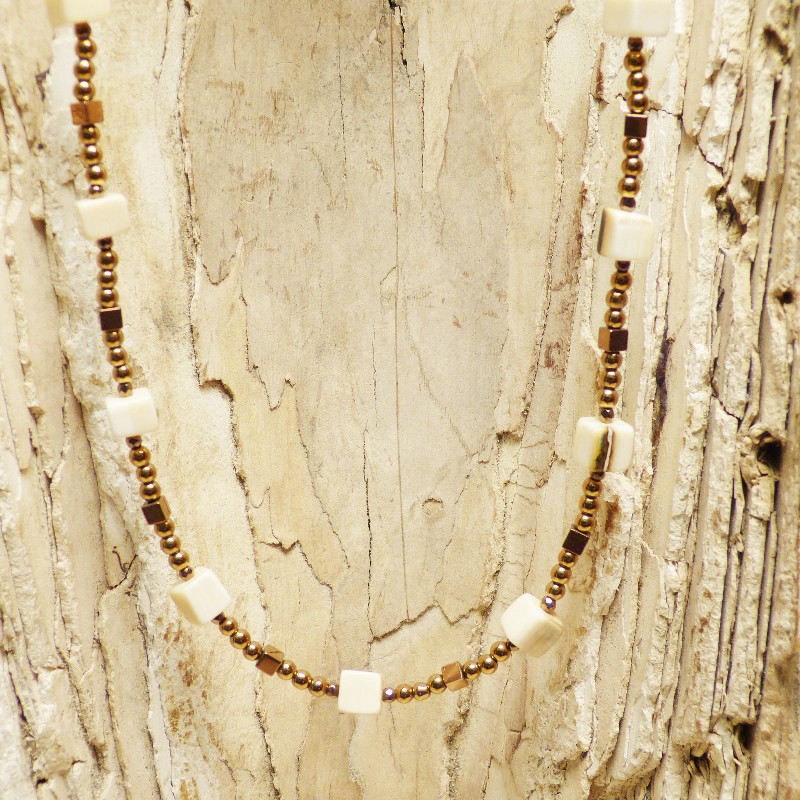 Hämatit-Würfeln und Kügelchen mit einer Stärke von ca. 3 mm. Kombiniert sind diese mit ca. 6 mm dicken Würfeln aus cremefarbenem