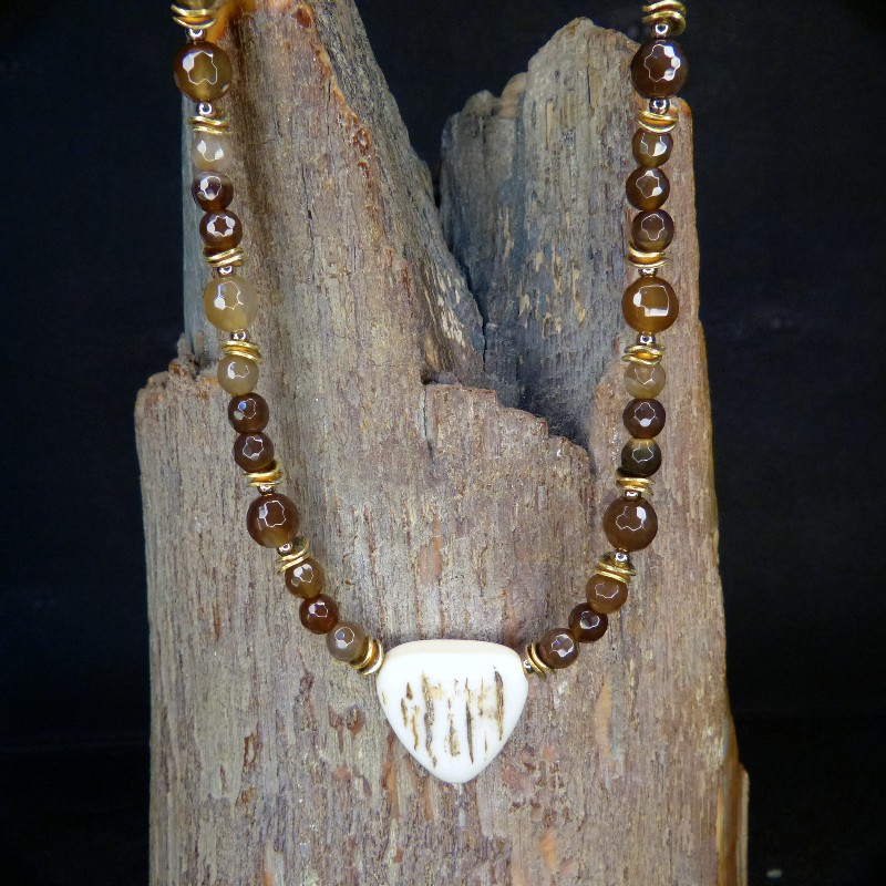 Zartes Collier aus ca. 6 - 8 mm großen und facettierten braunen Achatkugeln mit Zwischenelementen aus goldplattiertem Silber 925/-