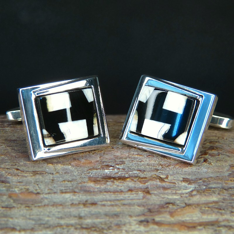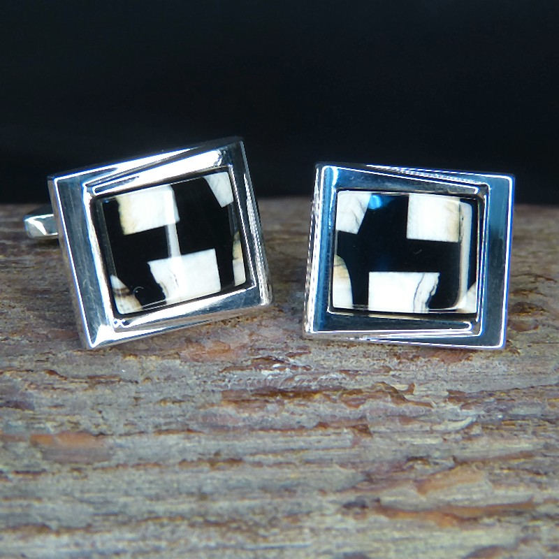 Edle Manschettenknöpfe aus 835/-er Silber mit Einlagen aus hellem Mammutelfenbein in schwarz/weiß Optik. Die solide gearbeitet Silberfassung verfügt über eine gut einrastende Mechanik die für sicheren Halt sorgt.