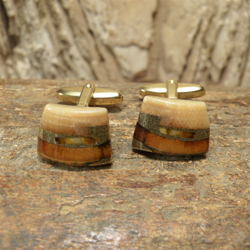 Schöne Manschettenknöpfe aus cremefarbenem und braunem Mammut-Elfenbein mit je einer Intarsie aus echtem Naturbernstein. Die Mammut-Elemente haben eine Größe von ca. 19 x 13,5 mm und sind mit der gut einrastenden Mechanik verstiftet und verklebt. Die Mechanik hat eine Goldauflage von 3 Micron und ist somit sehr haltbar.