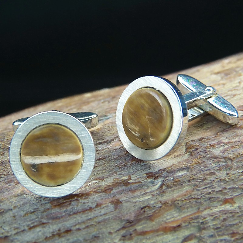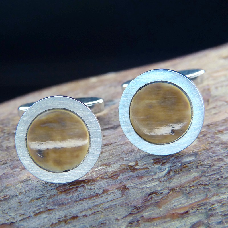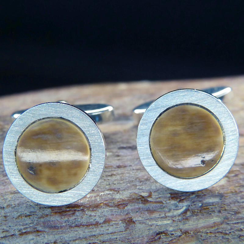 Manschettenknöpfe aus massivem Silber 835/- mit mattierter Oberfläche und Einlagen aus bräunlichem Mammut-Elfenbein aus der Rinde.