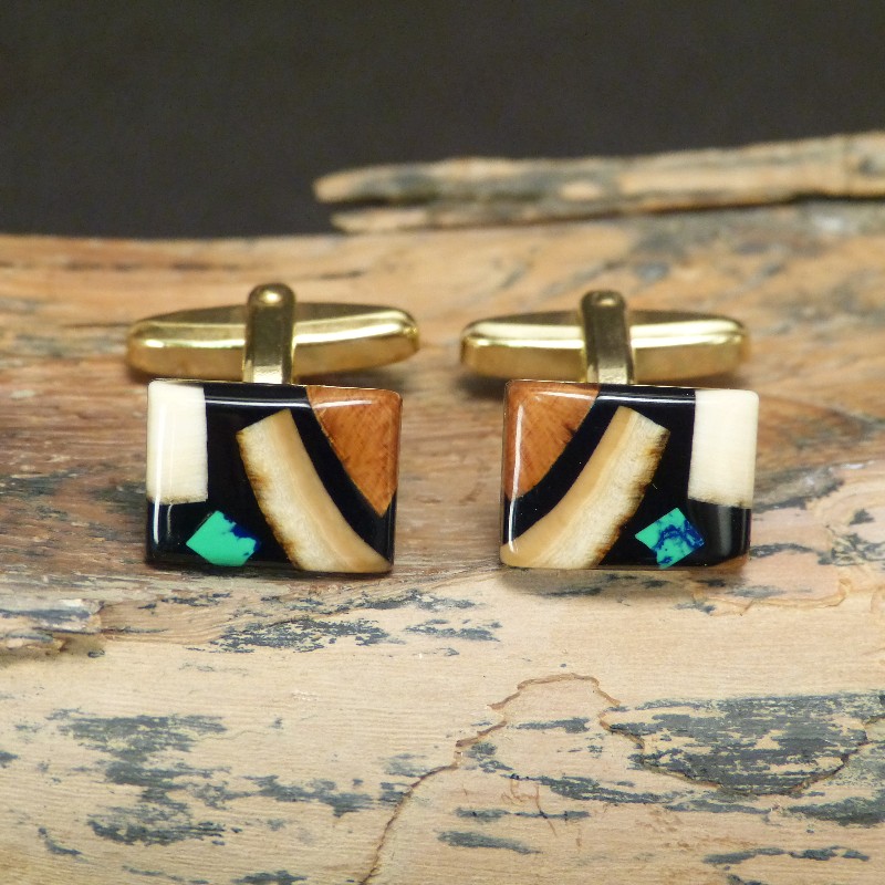 Kleine Manschettenknöpfe aus cremefarbenem und braunem Mammut-Elfenbein mit je einer Intarsie aus rekonstruiertem Azurit. Die gut einrastende Mechanik wurde mit 3 Micron Gold plattiert und auf der Rückseite mittels Stift und Platte sicher verschraubt und geklebt. Größe ca. 15 x 11 mm