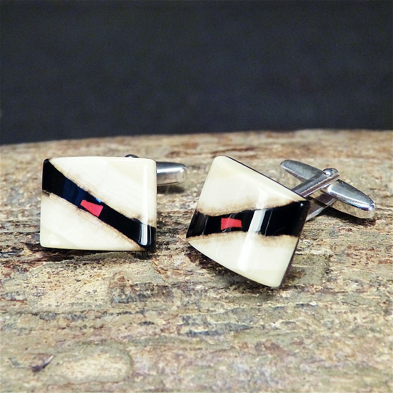 Fein gemaserte Manschettenknöpfe aus cremefarbenem Mammut-Elfenbein mit bräunlichen Färbungen und je einer Intarsie aus rekonstruierter Koralle.