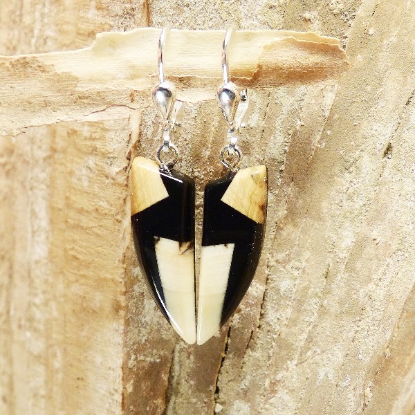 Kleine Ohrhänger aus hellem und cremefarbenem Mammut-Elfenbein in Zahnform geschliffen. Die Gesamtlänge beträgt ca. 37 mm, die Größe ohne Mechnik ist ca. 23 x 7 mm. Die Mechanik ist aus Silber 925/- und hat einen Sicherheitsbügel. Die Rückseite der Ohrhänger ist zur Stabilisierung mit schwarzem Ebenholz hinterlegt.