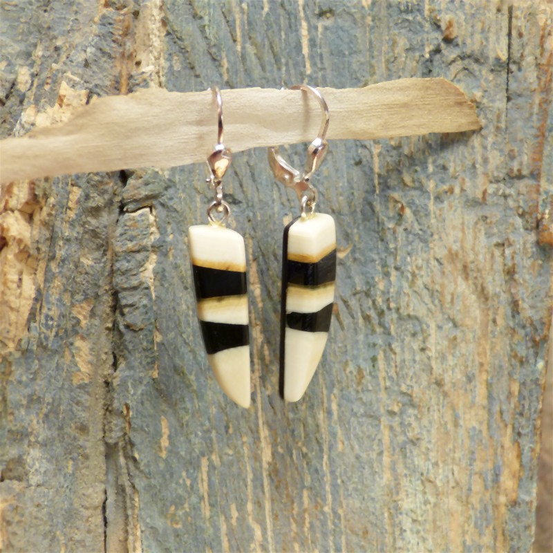 Kleine, zahnförmig geschliffene Ohrhänger aus mehrfarbigem Mammut-Elfenbein. Sie haben ohne Mechanik eine Größe von 23 x 6,5 mm und sind auf der Rückseite zur Stabilisierung mit Ebenholz hinterlegt. Die Sicherheitsmechanik ist aus 925/-er Silber gefertigt.