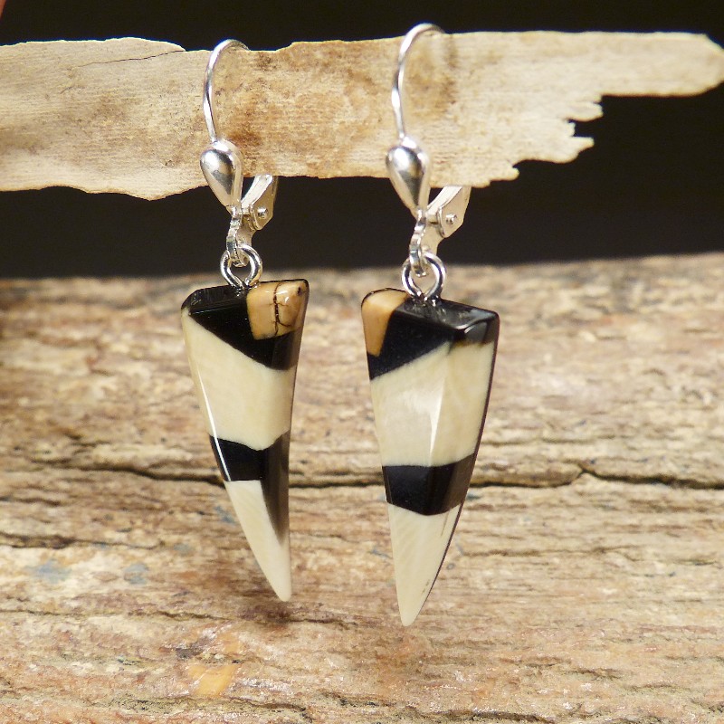 Zahnförmig geschliffene Ohrhänger aus cremefarbigem Mammut-Elfenbein. Sie haben ohne Mechanik eine Länge von ca. 24 x 9 mm und wurden auf der Rückseite zur Stabilisierung mit Ebenholz hinterlegt. Die Sicherheitsmechanik ist aus 925/-er Silber gefertigt.