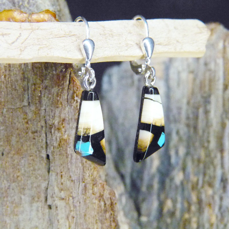 Kleine Ohrhänger aus Mammut-Elfenbein mit bräunlichen Färbungen und je einer kleinen Intarsie aus rekonstruiertem Türkis.