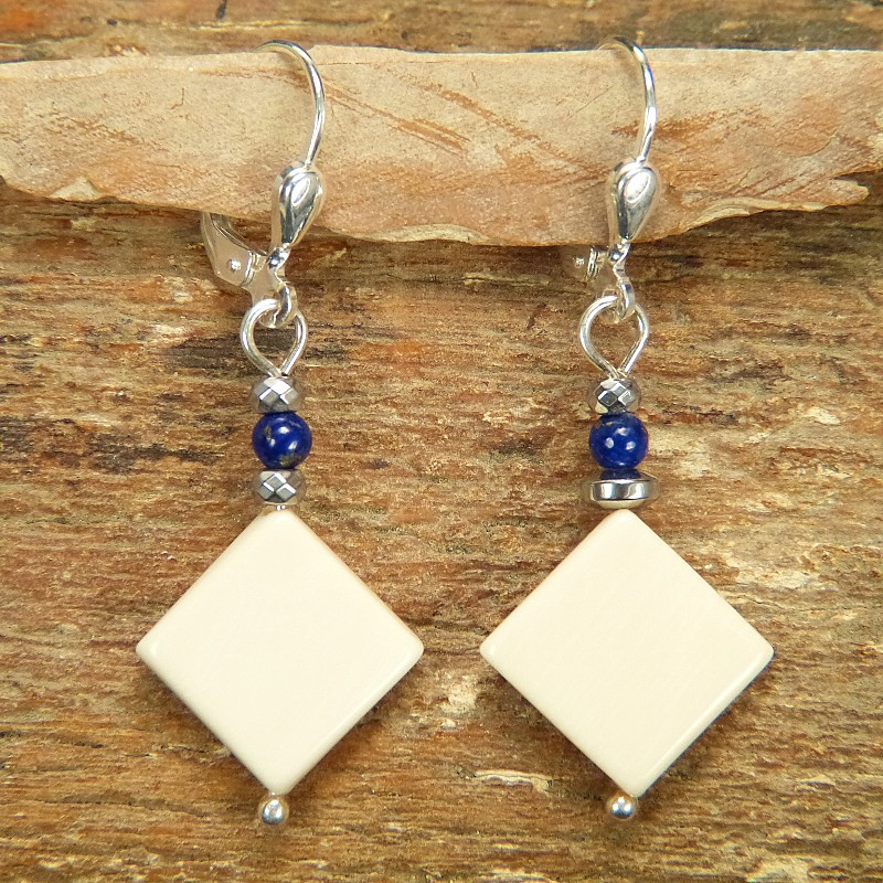 Feine Hängeohrringe aus ca. 12 x 12 mm großen Mammutplättchen mit heller Färbung, kombiniert mit Hämatit und kleinen Kugeln aus Lapislazuli.