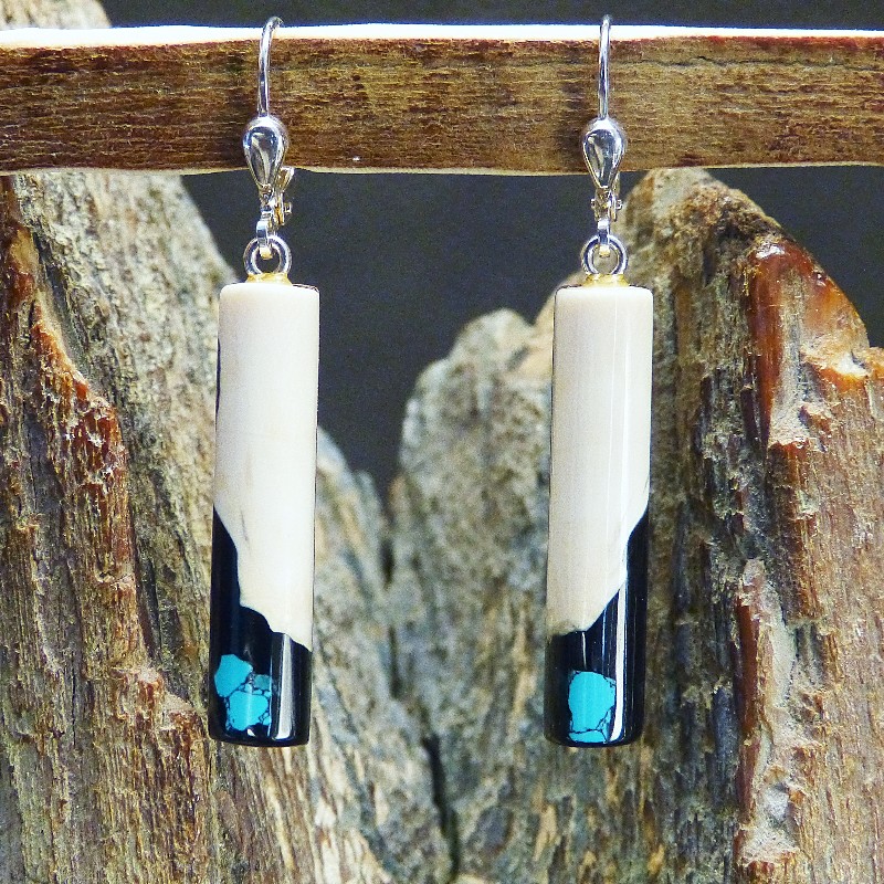 Ohrhänger aus hellem Mammut-Elfenbein mit feiner Maserung und je einer Intarsie aus rekonstruiertem Türkis. Sie haben ohne Mechanik eine Größe von 29 x 6,5 mm und sind auf der Rückseite zur Stabilisierung mit Nussbaumholz hinterlegt. Die Sicherheitsmechanik ist aus 925/-er Silber gefertigt.