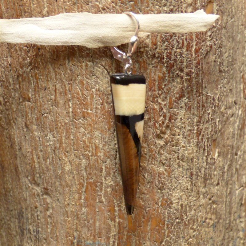 Einzelner Ohrhänger aus dunkelbraunem und cremefarbenem Mammutelfenbein. Die Rückseite wurde zur Stabilisierung mit Ebenholz