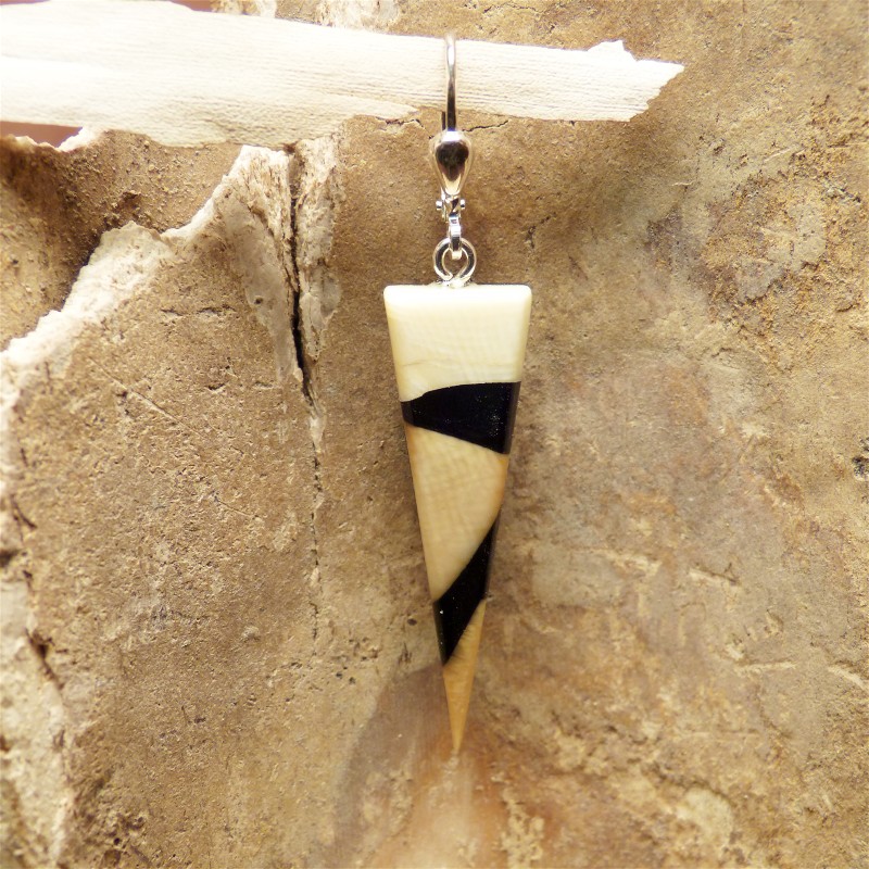Einzelner Ohrhänger aus schön gemasertem, cremefarbenem und hellem Mammutelfenbein. Die Rückseite wurde zur Stabilisierung mit Ebenholz