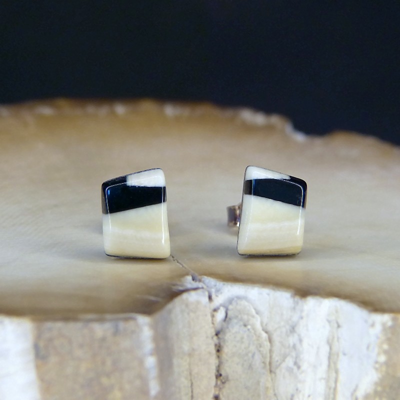 Kantig geschliffene Ohrstecker aus Mammut-Elfenbein schwarz/weiß. Sie haben eine Größe von ca. 9 x 6,5 mm und sind mit einer gut einrastenden Steckermechanik aus 925/-er Silber gearbeitet.